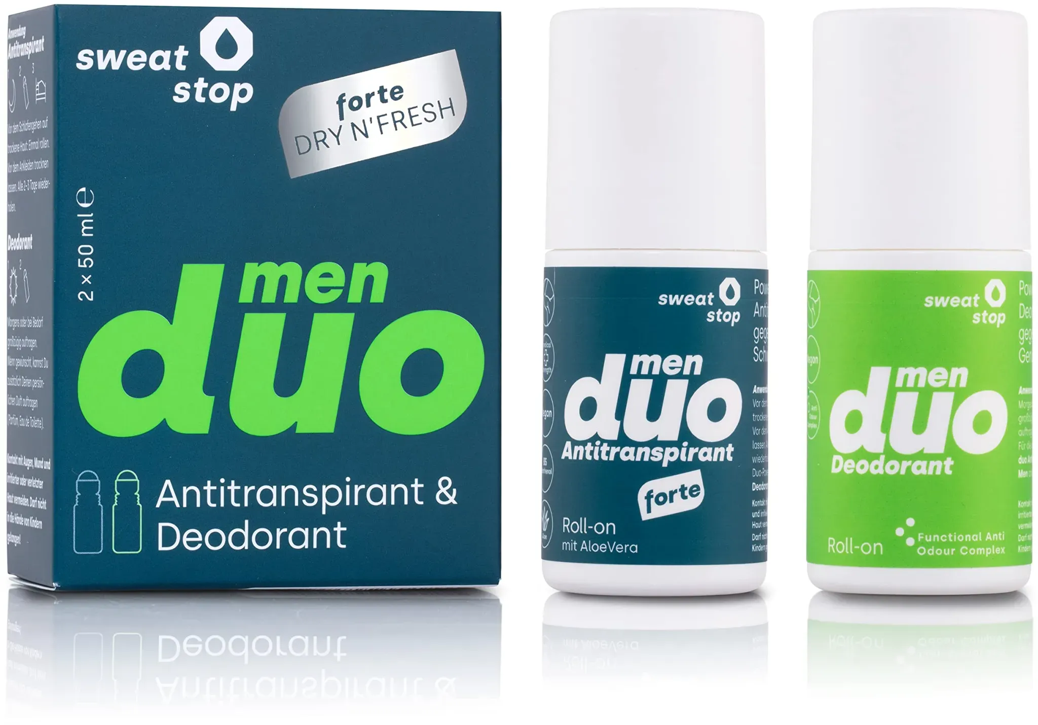 Kategorie: Deodorants - Sweat Stop - GTIN:7640139738219 - Dein duo DRY N'FRESH Power-Set gegen Schweiß- und Geruchsbildung! das Set enthält ein Antitranspirant und ein Deodorant bietet Sicherheit rund um die Uhr dermatologisch auf Hautverträglichkeit getestet Das Antitranspirant gegen Schweißbildung: wird vor dem Schlafengehen aufgetragen. Mit hautpflegendem Aloe Vera und Panthenol. NEU: mit dezentem Duft - 22,90 Euro bei Amazon Marketplace Beauty - gefunden von billiger.de Ein Duo-Set für Männer, das starken Schutz und Deodorant-Wirkung kombiniert, ideal für empfindliche Haut. ![]() ![]() Sweat Stop SweatStop Duo Men Antitranspirant & Deodorant Set gegen starkes Schwitzen & Geruch | 2 x 50ml Roll-on Antiperspirant mit Duft & Deo | Gegen Schweiß für empfindliche Haut | Duo Power Protection