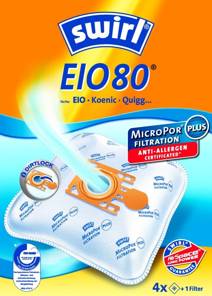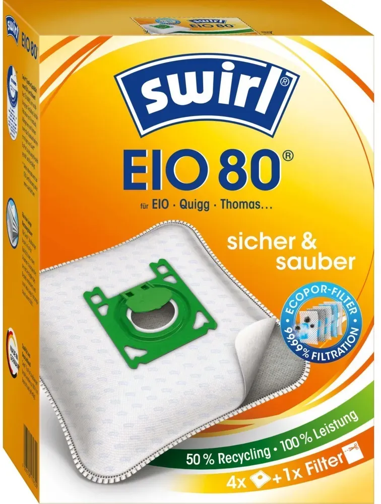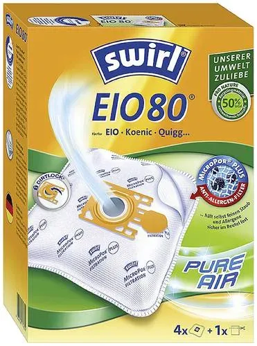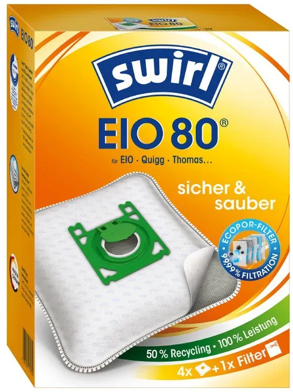 Kategorie: Staubsaugerbeutel - Swirl - GTIN:4260195056190 - 5 Lagen Vlies, hohe Filtration verschliessbar geeignet für Allergiker maximale Saugleistung Alternative zu *Swirl EIO 80 - 8,69 Euro bei Amazon Marketplace Kitchen - gefunden von billiger.de Ein solides Angebot für 4 Swirl EIO 80 Micropor Beutel, die eine gute Filterleistung versprechen. ![]() ![]() Swirl EIO 80 Micropor 4er