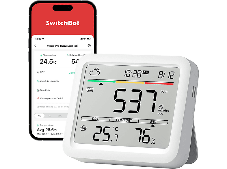 1 Händlerangebote bei billiger.de - Kategorie: Gasmelder - SwitchBot - Das SwitchBot Meter Pro ist ein fortschrittliches Luftqualitätsmessgerät, das eine umfassende überwachung der Umgebungsbedingungen ermöglicht. Mit einem grossen, multifunktionalen Bildschirm zeigt es gleichzeitig CO2-Werte, Temperatur, Luftfeuchtigkeit, Uhrzeit, Datum, Komfortlevel und Wettervorhersagen an. Dieses Gerät ist ideal für alle, die ein gesundes Raumklima schaffen möchten, da es präzise Daten liefert und bei Bedarf Warnungen ausgibt. Ausgestattet mit hochpräzisen NDIR-Sensoren misst das Gerät CO2-Werte in Echtzeit und bietet eine hohe Genauigkeit. Es ist Teil des SwitchBot-ökosystems, was bedeutet, dass es nahtlos mit anderen Smart-Home-Geräten zusammenarbeiten kann, um die Luftqualität zu optimieren. Die tragbare und langlebige Bauweise ermöglicht eine flexible Platzierung in verschiedenen Umgebungen, während die integrierte Batterie eine lange Lebensdauer bietet. - Grosser multifunktionaler Bildschirm zur gleichzeitigen Anzeige mehrerer Umgebungsparameter - Hochpräzise NDIR-Sensoren für genaue CO2-Messungen - Vielseitige Alarmmethoden zur überwachung von Luftqualitätsgrenzen - Integration in das SwitchBot-ökosystem für automatisierte Luftqualitätsmanagementlösungen - Tragbares Design mit langer Batterielebensdauer und flexibler Montageoption. - GTIN:0810150541663 ![]() SwitchBot Meter Pro (CO2 Monitor), Thermometer + Hygrometer