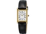 Seiko - EAN: 4954628256164 - Seiko Klassik Damen Armbanduhr zeitlose Eleganz trifft traditionelle UhrmacherkunstDie Armbanduhr aus der Seiko Klassik Kollektion verbindet gekonnt die Tradition der Uhrmacherei mit moderner Technik. Das goldfarbene, eckige Edelstahlgehäuse misst 29,4 19,6 mm und verleiht der Uhr eine schlanke und elegante Silhouette. Das weiße Zifferblatt ist mit schwarzen römischen Ziffern versehen, die zusammen mit den zwei schwarzen Zeigern eine klare, gut ablesbare analoge Zeitanzeige ermöglichen.Ein besonderes Highlight ist die goldfarbene Krone, die mit einem schwarzen Cabochon verziert ist und dem Design einen stilvollen Farbakzent verleiht. Das hochwertige Saphirglas schützt das Zifferblatt zuverlässig vor Kratzern und sorgt für eine klare Sicht aus jedem Winkel. Das schwarze Lederarmband mit Dornschließe sorgt für einen komfortablen und sicheren Sitz am Handgelenk.Mit dem präzisen Seiko Quarzwerk bietet diese Damenarmbanduhr eine zuverlässige Zeitmessung und eine wartungsarme Handhabung. Die Wasserdichtigkeit bis 5 bar (ca. 50 Meter) macht sie zur perfekten Begleiterin im Alltag, ob bei Regen oder beim Händewaschen.Produkthighlights:Goldfarbenes, eckiges EdelstahlgehäuseWeißes Zifferblatt mit schwarzen römischen ZiffernAnaloge Zeitanzeige mit zwei schwarzen ZeigernGoldfarbene Krone mit schwarzem Cabochon als elegantes DetailSchwarzes Lederarmband mit Dornschließe für sicheren HaltHochwertiges, kratzfestes SaphirglasWasserdicht bis 5 bar (ca. 50 ... ![]() ![]()