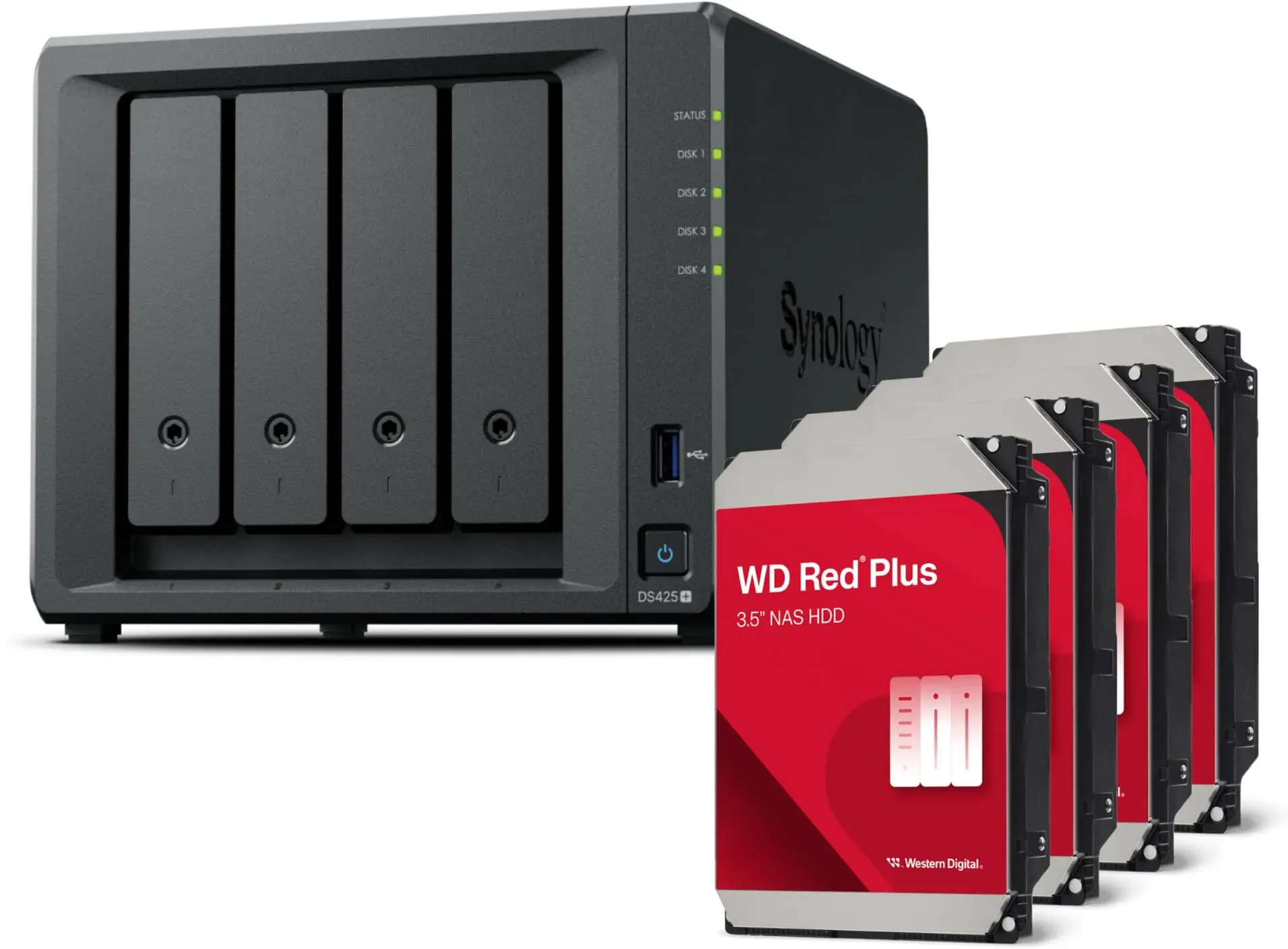 Verfügbarkeit: Auf Lager - Kategorie: NAS Server - Synology - GTIN:8592978663582 - Bundle aus SYNOLOGY DS425+ und 4x HAT3300-4T HDD mit je 4 TB Synology NAS Systeme & Synology Plus Drives für maximale Kompatibilität und Leistung. Mit intensiv getesteten und perfekt abgestimmten Festplatten nie wieder Gedanken über Kompatibilität, Langlebigkeit & Performance machen. EIN Ansprechpartner in allen Support-Fragen: Die Suche, ob ein Problem am NAS oder an 3rd-Party-Laufwerk vorliegt, ist damit Geschichte und schnellster Support aus einer Hand gewährleistet. Unterbrechungsfreie Firmware-Updates im Betrieb und damit lästigen Aufwand sparen für manuelle Updates über den PC sparen. - 1029,00 Euro bei Amazon Marketplace PC Notebook - gefunden von billiger.de Ein 16TB Bundle mit Western Digital Red Plus Festplatten, bekannt für ihre Zuverlässigkeit in NAS-Systemen. ![]() ![]() Synology DS425+ 16TB Bundle Western Digital (4X 4TB WD Red Plus) 4 Bay Desktop NAS; mit einem Intel Celeron J4125 Quad-Core-Prozessor, 2 GB DDR4 Ram