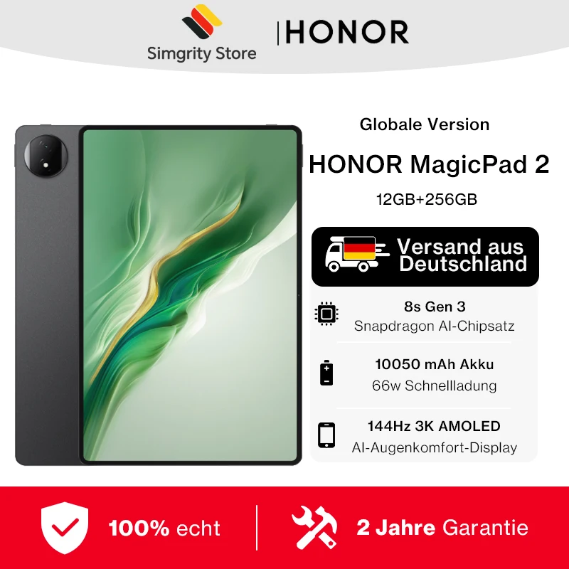 Kategorie: Tablet PCs - Honor - GTIN:6936520851614 - HONOR MagicPad 2 Tablet 12,3'' 3K OLED 144Hz Display Pad Snapdragon 8s Gen 3 10050mAh Akku Android 14 Globale Version - 434,71 Euro bei AliExpress - gefunden von billiger.de Dieses Honor MagicPad 2 ist eine gute Wahl für Nutzer, die ein aktuelles Android-Tablet mit viel Speicher und einem hochauflösenden Display suchen. ![]() ![]() HONOR MagicPad2 Tablet 12GB+256GB, 12,3 Zoll 144Hz OLED Display, Snapdragon 8s Gen 3, 10050mAh Akku, 8 Lautsprecher, Android 14 Tablet WiFi Version, Google Service, Mondlicht Weiß