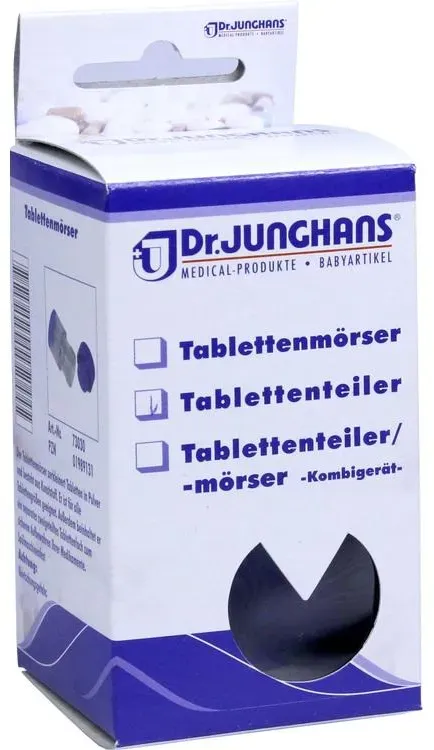 24 Händlerangebote bei billiger.de - Kategorie: Arzneimittel - cooper consumer health - Der Exakt Tablettenteiler stellt eine praktische Einnahmehilfe von Tabletten dar. Mit Hilfe des Teilers lassen sich Tabletten ohne größeren Kraftaufwand genau und schnell in zwei gleich große Teile spalten. Für das Teilen von Tabletten gibt es viele Gründe. Oft haben gerade ältere Menschen oder Kinder Schwierigkeit, große und kompakte Tabletten zu schlucken. Manchmal muss die Dosis angepasst werden etwa im Rahmen einer einschleichenden oder ausschleichenden Behandlung. Gelegentlich steht ein Präparat auch nicht der erforderlichen Dosierung zur Verfügung. Der Exakt Tablettenteiler ist mit einem leichten Druck auf die Oberseite zu bedienen. Damit wird gewährleistet, dass der vom Arzt aufgestellte Verordungsplan und die richtige Dosierung eingehalten sowie die Einnahme erleichtert wird. - GTIN:4150035467227 - PZN:03546722 Dieses Kombigerät von Dr. Junghans bietet sowohl eine Teiler- als auch eine Mörserfunktion, was es sehr vielseitig macht. ![]() ![]() Dr. Junghans Tablettenteiler Mörser Kombi