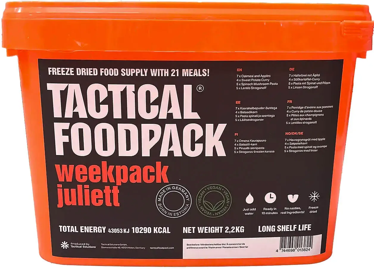Kategorie: Fertiggerichte - Tactical Foodpack - GTIN:4744698010755 - Tactical Foodpack Weekpack Tango 7 Tage Gourmetgenuss im Outdoor-Format. Mit dem Weekpack Tango von Tactical Foodpack erlebst du Trekkingverpflegung auf einem völlig neuen Niveau. Dieses exklusive Set enthält 21 ausgewählte Gourmet-Mahlzeiten für eine Woche perfekt abgestimmt auf den Energiebedarf einer Person. Jedes Gericht ist sorgfältig komponiert, geschmacklich ausgereift und bereit, auch unter freiem Himmel kulinarisch zu begeistern.Ob Lachs-Pasta in Weißweinsauce, geschmortes Rind in Burgundersauce oder feines Schokoladenmüsli mit Kirschen Tango kombiniert die neuesten und raffiniertesten Kreationen von Tactical Foodpack. Die Rezepte werden regelmäßig überarbeitet, damit du stets mit frischen Ideen und Aromen versorgt bist. Und trotz der Qualität sparst du: Im Vergleich zum Einzelkauf ist dieses Set ganze 20 % günstiger.Mit insgesamt 10.466 kcal bei nur 3,7 kg Gesamtgewicht bietet das Weekpack Tango maximale Energie bei minimalem Packmaß. Die Hauptgerichte sind bis zu haltbar, das Müsli bis zu ideal für längere Touren oder als Notvorrat. Verpackt in einem wasserdichten Eimer ist alles sicher und griffbereit verstaut. Weekpack Tango ist die erste Wahl für alle, die beim Outdoor-Essen keine Kompromisse machen wollen ob auf Expedition, im Van oder im Alltag.enthält 21 Gourmet-Mahlzeiten für eine Woche (1 Person)exklusive Auswahl der neuesten und raffiniertesten Tactical Foodpack-Gerichte10.466 kcal ... ![]() ![]() Tactical Foodpack Weekpack Juliett (21 Mahlzeiten) - vegan I Gefriergetrocknete Mahlzeiten I zum Verzehr bereit I MRE I Survival I Outdoor Nahrung I Trekking Nahrung I Expedition I Office
