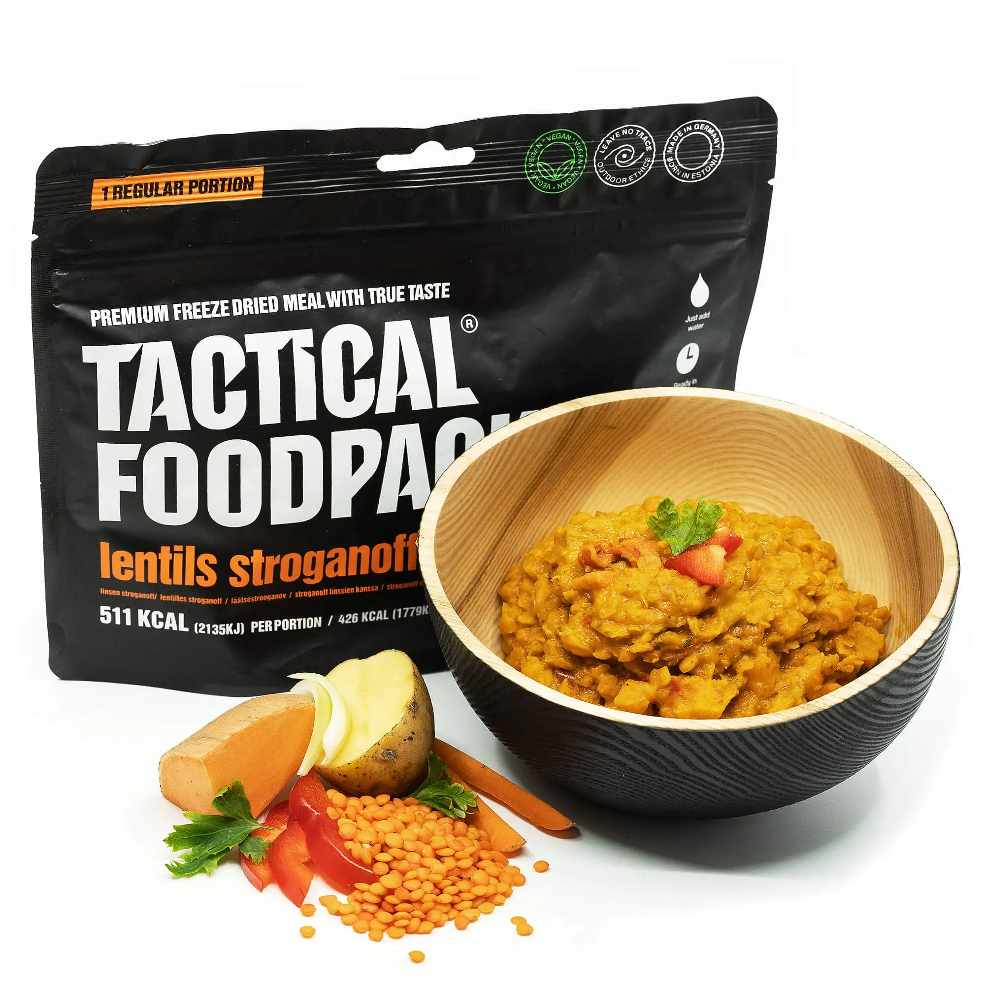 Tactical Foodpack - EAN: 4744698014029 - Neben gefriergetrockneter Wandernahrung bietet Tactical Foodpack auch Smoothie-Produkte an. Wie alle Produkte von Tactical Foodpack überzeugt auch dieser Smoothie nicht nur durch seinen hervorragenden Geschmack, sondern auch durch seine hervorragenden Nährwerte. Die flache Verpackung ist leicht zu tragen, und der Lippenverschluss ermöglicht ein gründliches Schütteln nach dem Hinzufügen von Wasser. - Die 60-Gramm-Packung enthält: - 287 kcal Energie - 14 Gramm Protein - 16,3 Gramm Fett, davon 15,3 Gramm gesättigte - 20,9 Gramm Kohlenhydrate, davon 5,4 Gramm Zucker - 14,2 Gramm Protein - 100 mg Salz Zutaten: Schwarze Johannisbeere (19 %), Erdbeerpüree (19 %), Rhabarberpüree (19 %), Kaseinpulver (14 %) (Milch), Maltodextrin, MCT-öl, Zitronensäure, Schwarze-Johannisbeer-Essenz. MCT-öl (mittelkettiges Triglyceridöl) ist eine Fettsäure aus Capryl- und Caprinsäure, die von Sportlern bevorzugt wird, da sie zusätzliche Energie liefert und als Booster wirkt, wenn mehr Kalorien als üblich verbrannt werden. Alle Mahlzeiten von Tactical Foodpack werden in Europa hergestellt. Die Marke verfügt über Fabriken in Estland und Deutschland. - bei scandinavianoutdoor.de - aus Yadore Produktdaten Dieses vegane Gericht bietet eine herzhafte und nahrhafte Option für alle, die auf Fleisch verzichten möchten. ![]() ![]() Tactical Foodpack Hauptmahlzeit Linsen Strogonov