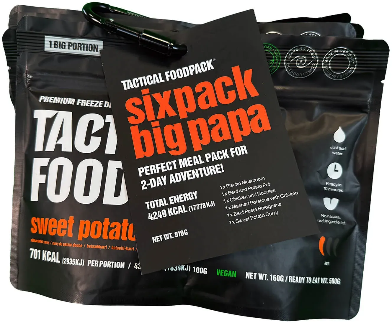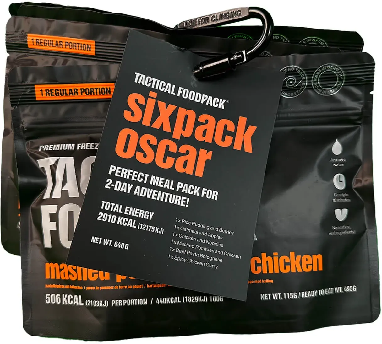 Kategorie: Fertiggerichte - Tactical Foodpack - GTIN:4744698010786 - Das Sixpack Oscar von Tactical Foodpack ist dein idealer Begleiter für ein zweitägiges Outdoor-Abenteuer. Mit sechs verschiedenen, vollwertigen Mahlzeiten bietet dir dieses Set eine ausgewogene und leckere Verpflegung von süßem Frühstück bis hin zu herzhaften Hauptgerichten. Im Vergleich zu anderen Tactical Foodpack-Sets enthält das Oscar-Sixpack etwas leichtere Kalorienwerte, ist aber genauso sättigend und nährstoffreich. Der Clou: Im Set sparst du rund 10 % gegenüber dem Einzelkauf der enthaltenen Produkte.Enthalten sind folgende Gerichte: Milchreis mit Himbeeren, Haferbrei mit äpfeln, Hähnchen mit Nudeln, Kartoffelpüree mit Hähnchen, Bolognese mit Rindfleisch und ein scharfes Hähnchen-Curry. Alle Mahlzeiten sind gefriergetrocknet, lange haltbar und besonders einfach zuzubereiten heißes Wasser aufgießen, kurz warten und genießen.Das Sixpack Oscar verbindet unkomplizierte Handhabung mit abwechslungsreichem Geschmack ideal für alle, die draußen unterwegs sind und sich auf ihre Verpflegung verlassen wollen.ideal für 2-tägige Outdoor-Abenteuerenthält 6 verschiedene, vollwertige Mahlzeitenetwas leichterer Kalorienwert als andere Tactical Foodpack-Sets10 % günstiger im Set als im Einzelkaufeinfache Zubereitung durch Aufgießen mit heißem Wasserlange haltbar und gefriergetrocknetabwechslungsreiche Auswahl: süßes Frühstück und herzhafte Hauptgerichteperfekt für Camping, Trekking oder NotvorratInhalt:1x Milchreis ... Das Sixpack Big Papa bietet eine größere Portion pro Mahlzeit und ist somit ideal für Personen mit höherem Energiebedarf. ![]() ![]() Tactical Foodpack Sixpack Big Papa