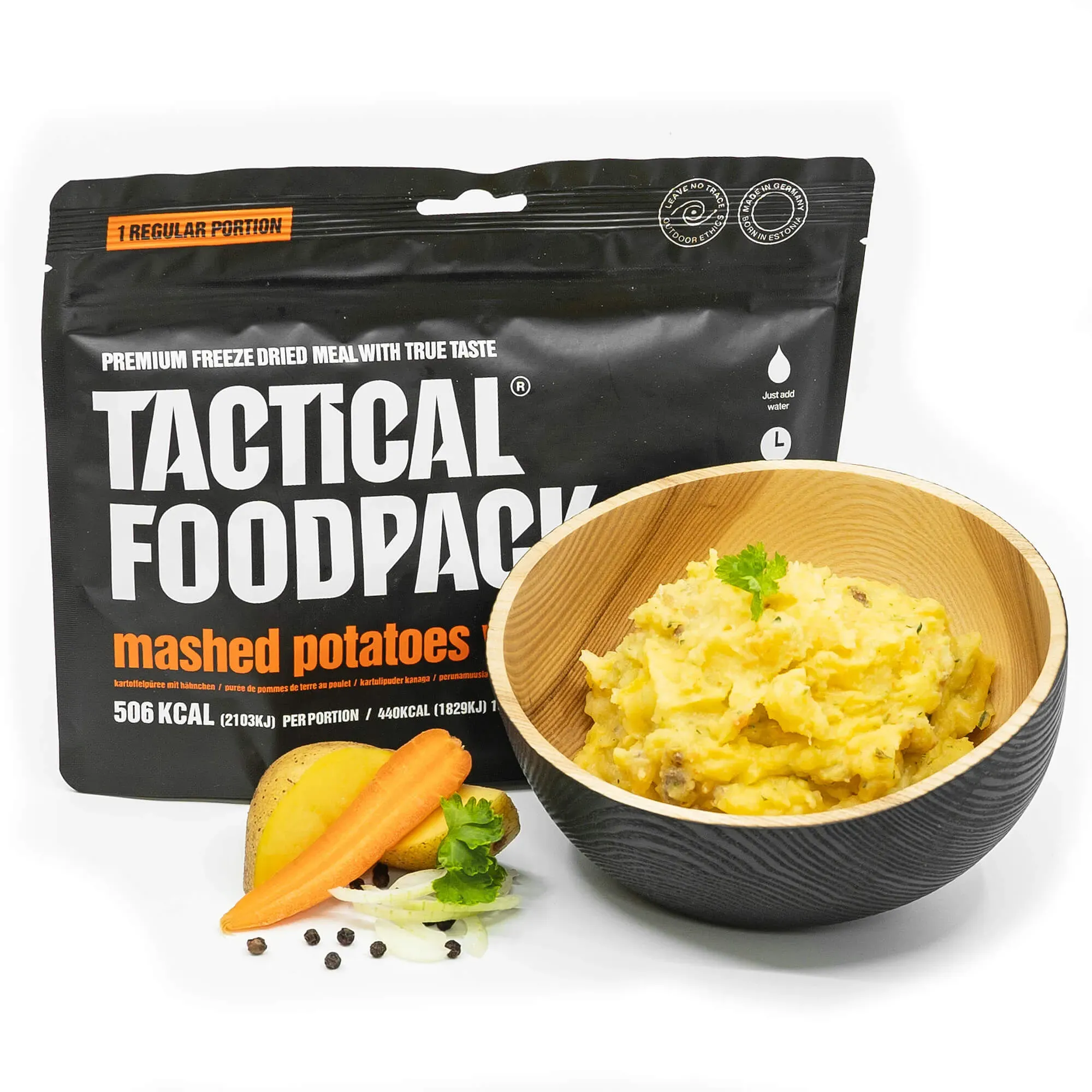 Hauptgerichte Sonstige - EAN:4744698010540 - Das Tactical Foodpack Rindfleisch Bibimbap bringt Dir den Geschmack Koreas direkt ins Biwak, Zelt oder Fahrzeug. Dieses Outdoor-Gericht basiert auf einem traditionellen koreanischen Rezept und kombiniert herzhaftes Rindfleisch mit Reis, Gemüse und asiatischen Gewürzen zu einer sättigenden, aromatischen Mahlzeit. Mit seiner 100€¯% natürlichen Zusammensetzung - ohne Zusatzstoffe oder Konservierungsmittel - ist es ideal für Abenteurer, Einsatzkräfte und Prepping-Fans. Die Zubereitung ist denkbar einfach: Wasser (heiß oder kalt) direkt in den Beutel geben, umrühren, ziehen lassen - fertig ist Dein asiatischer Energiekick. Dank des geringen Packmaßes und Gewichts eignet sich das Bibimbap perfekt für den Rucksack. Der stabile Beutel erlaubt Dir das Essen direkt aus der Verpackung, ganz ohne zusätzliches Geschirr. Lange haltbar und schnell zubereitet, ist dieses Gericht die perfekte Kombination aus exotischem Geschmack und praktischer Einsatzfähigkeit - genau das, was Du in der Wildnis oder im Krisenfall brauchst. - gefunden von Kelkoo Dieses Kartoffelpüree mit Hähnchen in großer Portion ist ideal für den großen Hunger nach anstrengenden Aktivitäten. ![]() ![]() Tactical Foodpack Hauptmahlzeit Kartoffelbrei mit Hähnchen Big Portion