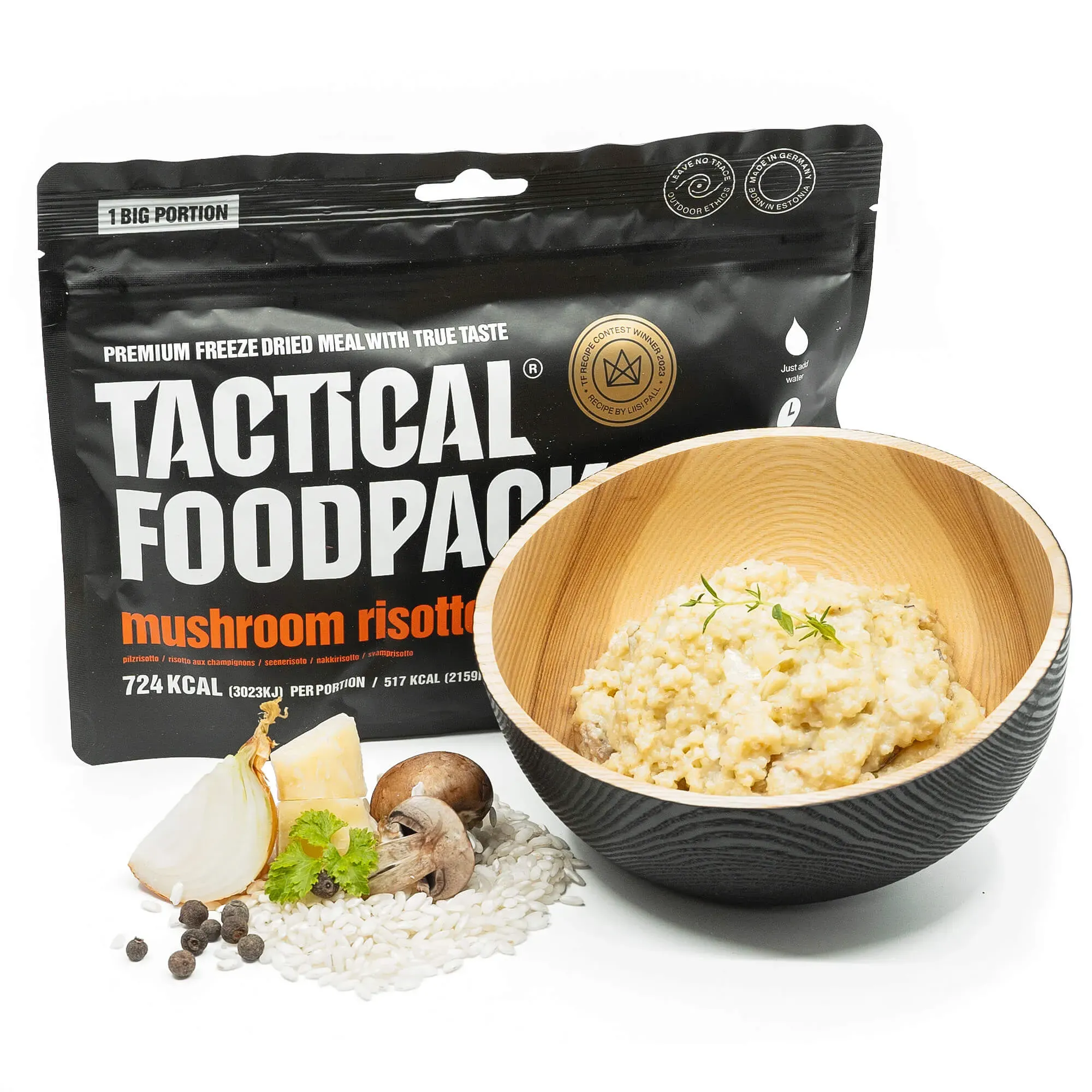 Kategorie: Fertiggerichte - Tactical Foodpack - GTIN:4744698010571 - Die gefriergetrockneten Fertigmahlzeiten von Tactical Foodpack sind die ideale Wahl, um dich auf deinem nächsten Outdoor-Abenteuer mit Energie zu versorgen. Ob nach einer langen Wanderung oder als nahrhafter Start in den Tag, diese Mahlzeiten bieten dir schnellen und unkomplizierten Genuss, egal wo du bist. Dank einer speziellen Gefriertrocknungstechnologie bleiben der volle Geschmack und die Nährstoffe der Gerichte erhalten, und das bei einer Haltbarkeit von bis zu n ganz ohne Zusatz- oder Konservierungsstoffe.Die Zubereitung ist denkbar einfach und dank der angegebenen Skala im Inneren des Beutels noch leichter: Gib heißes Wasser hinzu, rühre um, und schon nach wenigen Minuten ist deine Mahlzeit fertig. Sollte kein heißes Wasser zur Verfügung stehen, kann das Gericht auch mit kaltem Wasser zubereitet werden, was besonders praktisch in extremen Bedingungen ist. Die Tactical Foodpack-Mahlzeiten lassen sich auch direkt über dem Feuer erwärmen, wenn du unterwegs bist und nur wenig Ausrüstung zur Hand hast.Mit 100% natürlichen Inhaltsstoffen und einer durchdachten Balance aus Nährstoffen und Geschmack bieten diese Mahlzeiten ein hausgemachtes Gefühl, egal ob auf Expedition, beim Camping oder als Vorrat für unvorhergesehene Situationen. Tactical Foodpack ist nicht nur für Outdoor-Abenteuer ideal, sondern auch eine sinnvolle Ergänzung für jeden Notvorrat lange haltbar, leicht zu lagern und schnell ... Eine größere Portion des beliebten Pilzrisottos, perfekt für alle, die eine sättigende vegetarische Mahlzeit suchen. ![]() ![]() Tactical Foodpack Hauptmahlzeit Pilzrisotto Big Portion