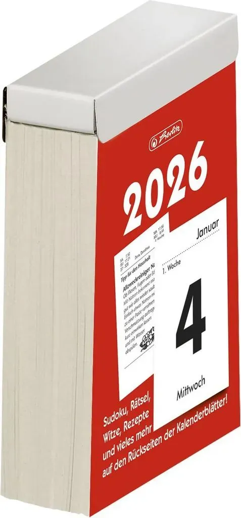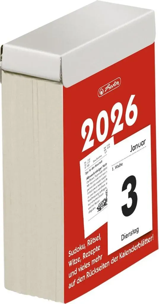 Kategorie: Organizer - Herlitz - GTIN:4008110431918 - Tages-Abreißkalender Nr. 3, 2026 - Blattgröße: 55 x 80 mm - Kalendarium: 1 Tag pro Seite - Druck: 2-farbig, rot/schwarz - Papier: 48g/qm - Ausstattung: Metallhalterung , Rückseiten bedruckt mit Sudoku, Witzen, Tipps, Sprüchen, Gedenktagen, Rezepten herlitz Tages-Abreißkalender Nr.3 Der herlitz Tages-Abreißkalender ist ein traditioneller Kalender, bei dem für jeden Tag des Jahres ein eigenes Blatt vorgesehen ist. Am Ende des Tages wird das Blatt abgerissen, um das nächste freizulegen. Diese Kalender sind nicht nur praktisch, sondern bieten auch oft zusätzliche, nützliche Inhalte.Blattgröße: 55 x 80 mmKalendarium: 1 Tag pro SeiteDruck: 2-farbig, schwarz und rotauf den Rückseiten Rätsel, Witze, Tipps uvm.MetallhalterungPapier: 48 g/qmAlle Jahre wieder - Kalender sind für die Terminplanung unverzichtbar! Mit den vielfältigen Kalendern von herlitz gelingt dies im Beruf, der Schule und im täglichen Gebrauch. - 3,69 Euro bei Kaufland.de - gefunden von billiger.de ![]() ![]() Brunnen Abreißkalender 2026