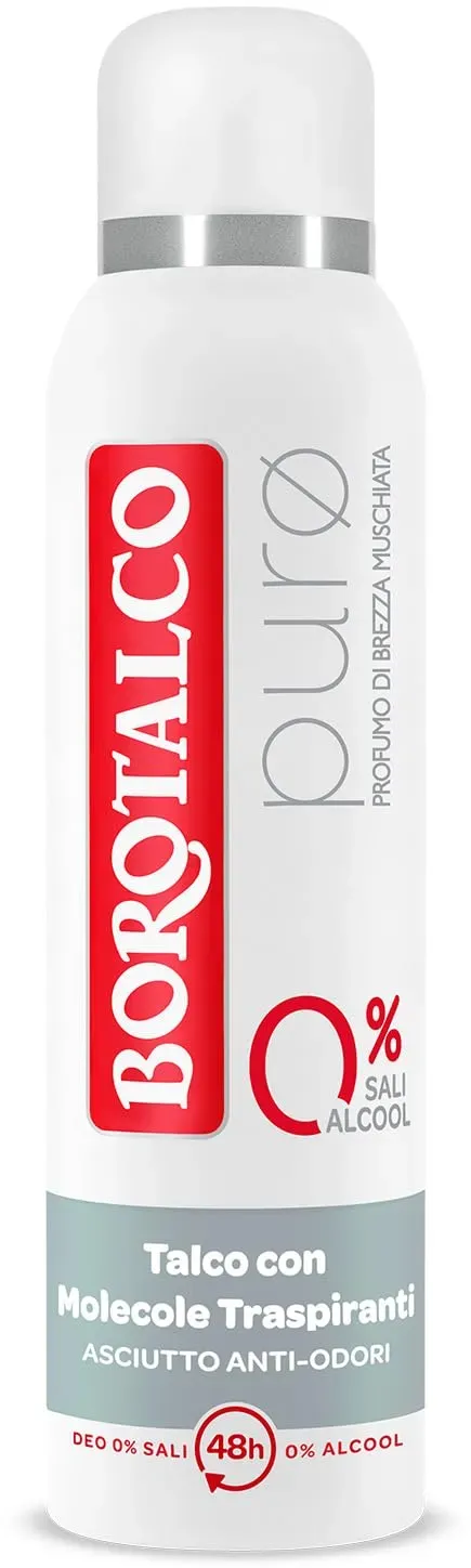 Kategorie: Deodorants - Borotalco - GTIN:8002410046281 - Formel: Mit essentiellem Talkum, verstärkt die trockene Wirksamkeit des Talkums dank Zink- und Tapioka-Pulver für einen trockenen und geruchshemmenden Effekt ohne Kompromisse - 7,90 Euro bei Amazon Marketplace Beauty - gefunden von billiger.de Dieses Borotalco Deodorant Spray bietet 48h Wirksamkeit mit Talkum und Moschusduft, ideal für den täglichen Gebrauch. ![]() ![]() Borotalco, Deodorant Spray Reine Moschusbrise, mit Talkum mit atmungsaktiven Molekülen, ohne Alkohol und Aluminiumsalze, trocken gegen Gerüche, 48h Wirksamkeit, Duft Moschus - 1 Flasche mit 150 ml
