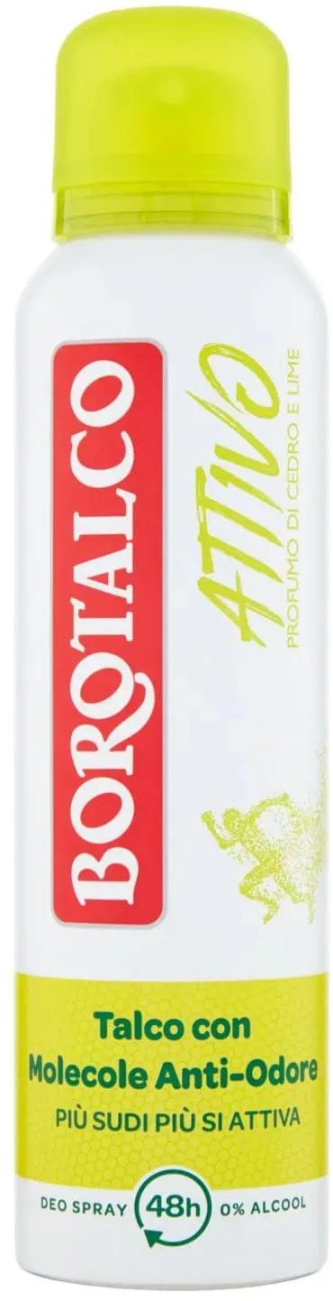 8 Händlerangebote bei billiger.de - Kategorie: Deodorants - Borotalco - Deodorante Deodorante Spray 150ml Fresco - Borotalco ist das einzige Produkt, das Ihnen effektiv den ganzen Tag über Frische verleiht. Dieses hochwertige Deo-Spray wurde von der renommierten Marke Borotalco entwickelt, die seit Jahren führend auf dem Markt für Körperpflegeprodukte ist. Jetzt können Sie für lange Zeit unvergleichliche Frische und Sicherheit genießen.Seine einzigartige Antitranspirant-Formel eliminiert Schweißgeruch und bietet Ihnen lang anhaltenden Schutz. Ob Sie einen aktiven Tag im Büro verbringen oder hart im Fitnessstudio trainieren, dieses Deodorant hält Ihre Haut trocken und frisch. Sie werden sich sicher fühlen, dass Deodorante Deodorante Spray 150ml Fresco - Borotalco für Sie arbeitet.Das Produkt ist als Spray erhältlich, wodurch es bequem und einfach zu verwenden ist. Sie müssen sich keine Sorgen mehr über unansehnliche Flecken auf Ihrer Kleidung oder ein unangenehmes, fettig-lipides Gefühl machen. Das Deodorant zieht schnell ein und hinterlässt keine Rückstände oder ein klebriges Gefühl. Außerdem sorgt sein angenehmer, erfrischender Duft dafür, dass Sie sich lange Zeit frisch und sauber fühlen.Deodorante Spray 150ml Fresco - Borotalco ist die ideale Wahl für alle, die hohe Qualität und Wirksamkeit zu schätzen wissen. Mit ihm können Sie den unangenehmen Schweißgeruch vergessen und den ganzen Tag lang Komfort genießen. Egal ob Sie ein Mann oder eine Frau sind, dieses Deodorant ist ... Das Borotalco Aktives gelbes Lufterfrischer-Spray bietet eine frische Wirksamkeit mit Zeder und Limette für 48 Stunden. ![]() ![]() Borotalco, Aktives gelbes Lufterfrischer-Spray, alkoholfreie Formel und mit Talkum mit Anti-Geruch-Molekülen, frische Wirksamkeit, 48 Stunden Wirksamkeit, Zeder und Limette - 1 Flasche 150 ml
