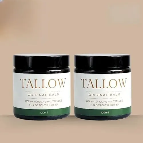 Zustand: Neu - 224,96 € / l - Cremes Bodycremes - Tallow Tallow GmbH - - EAN: 4270004482737 - - Verkäufer: Tallow Original Balm im amazon.de Marketplace ![]() ![]() TALLOW ORIGINAL BALM NATUR aus Deutschland,100% Bio Rindertalg Creme für Hautpflege, Bio Beef Tallow Skincare von grasgefütterten Rindern vom Bodensee,100% natürliche Feuchtigkeitscreme (120ml x 2)
