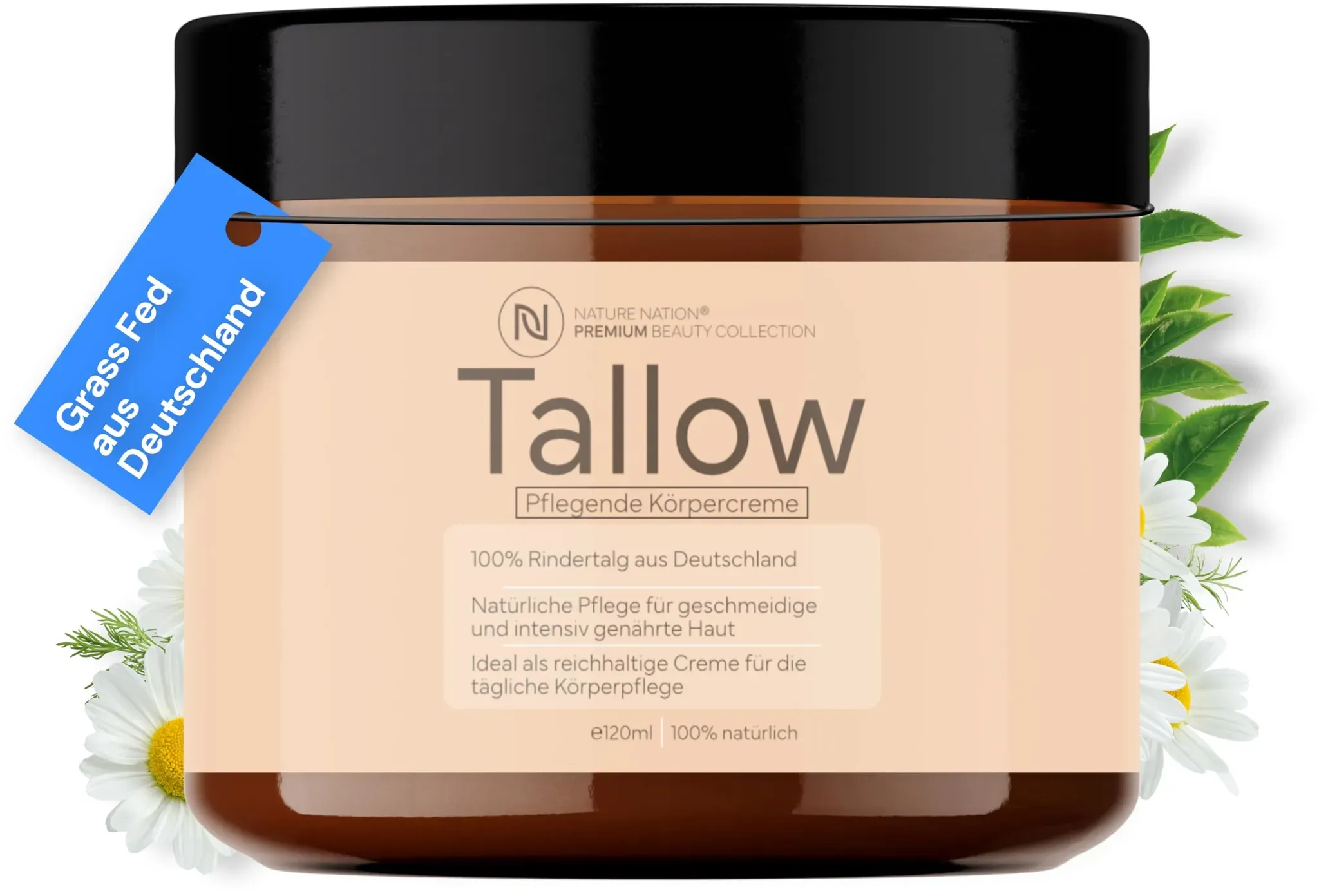 Auf Lager Versand durch AmazonTallow Rindertalg - Beef Tallow Creme - Deutsche Rinder aus freier & artgerechter Weidehaltung - 100% natürliche Hautpflege - Original Balm Pur, Skincare mit Vitamin E & ohne Chemie (120ml, Natur)