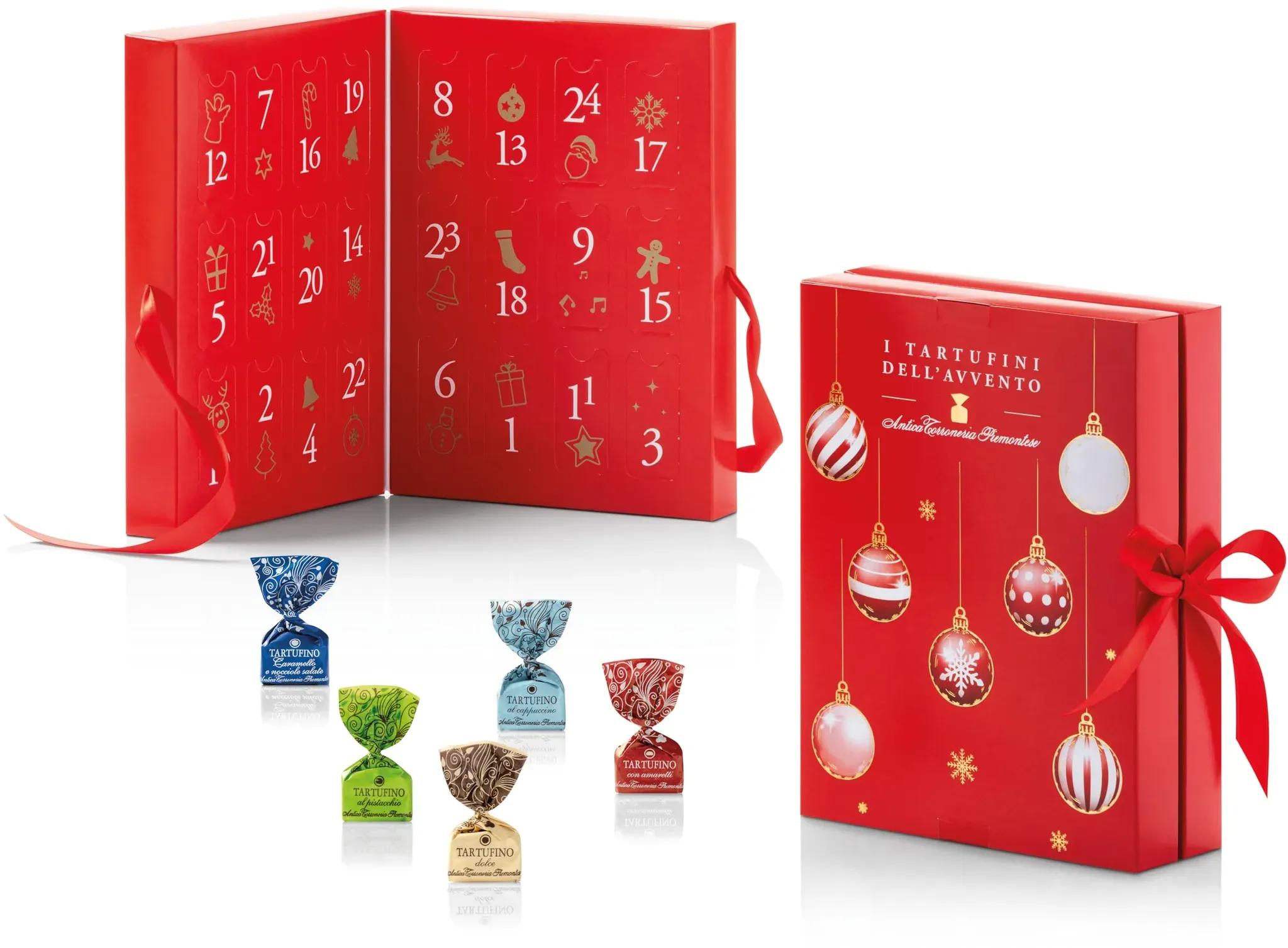 Kategorie: Adventskalender - Antica Torroneria - GTIN:8009973504784 - PREMIUM Schokoladen Trüffel Pralinen Adventskalender (175 g) mit 5 Sorten italienische Schokoladen-Trüffel Antica Torroneria Piemontese aus Italien: Dolce, Bianco, Gianduja, Pistacchio, Extranero 25 Tartufino Trüffel Pralinen (a 7g) aus Italien in einem wunderschönen Weihnachtskalender, mit dem man der Familie, Freunden, Bekannten, Kollegen und Geschäftspartnern eine besondere vorweihnachtliche Freude bereiten kann. Perfekte Geschenkidee: Die Weihnachtszeit bis Heiligabend wird durch die Trüffel von Antica Torroneria Piemontese besonders versüßt. Das weihnachtliche Design des Adventskalenders macht diesen auch zum idealen Geschenk. Für Genießer: Trüffelpralinen-Liebhaber werden die Weihnachtsedition dieser italienischen Spezialität lieben und sich jeden Tag auf eine tolle Schokoladen-überraschung freuen. Nur das Beste: Weiße Schokolade, dunkle Schokolade und ausgewählte Zutaten, wie IGP Haselnüsse, Pistazien und feine Kakaobutter machen die Tartufini / Tartufo sehr aromatisch und zu einer herausragenden Köstlichkeit im weihnachtlichen Adventskalender. - 29,90 Euro bei Amazon Marketplace Automotive - gefunden von billiger.de Dieses Geschenkset in einem edlen Geschenkbuch mit 32 gemischten Trüffel-Pralinen ist eine besonders ansprechende Geschenkidee. ![]() ![]() GUSTONE. Geschenkset Schokoladen Trüffel im edlen Geschenkbuch- Antica Torroneria Tartufo | Trüffel dolce Tartufi | Trüffel-Pralines gemischt 32 Stück