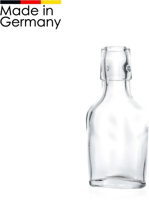 Kategorie: Barzubehör - flaschenbauer - Die ovale und flache 100ml Taschenflasche bringt eine Bügelverschluss Mündung mit und ist damit auslaufsicher. Sie ist eine tolle und stabile Flasche für unterwegs, da sie in nahezu jede Tasche passt. Diese Taschenflasche wird gern für das Abfüllen von Spirituosen verwenden. Aber auch delikates öl und Sirup wird in diese stabilen Flaschen gern gefüllt. Die ovale flache 100ml Taschenflasche wird in Deutschland hergestellt, so dass wir diese stolz mit unserem Siegel Made in Germany präsentieren können. Eigenschaften der kleinen ovale und flache 100ml Taschenflasche100ml FüllvolumenVerschlussform: Bügelverschlusshitzebeständiges Glas für die Heißabfüllung geeignetLikör, öl, Spirituosen, Essig, Limonade, Getränke, Brände, WhiskyVerschluss der kleinen ovale und flache 100ml Taschenflasche Die ovale und flache Taschenflasche mit 100ml wird mit unserem Bügelverschluss Spirit verschlossen. Dieser Verschluss sichert die Flasche vor dem Auslaufen und bringt zusätzlich noch eine angenehme Optik mit. Er eignet sich für Liköre bis 18% Alkoholgehalt. Bei höherem Gehalt solltet ihr unsere Kunststoffkappe zusätzlich verwenden. Der Bügelverschluss ist bei uns im Shop bestellbar und besteht aus Porzellan, einem Dichtring und Edelstahl.Unsere Empfehlung und Tipps Mit unseren kleinen3er Set Edelstahltrichtern, könnt ihr diese Flaschen ohne Kleckern kinderleicht mit euren selbst gemachten Likören füllen. LieferhinweisIhr erhaltet die ovale und flache ... Diese preisgünstige Edelstahl-Taschenflasche ist eine solide und praktische Wahl für den täglichen Gebrauch. ![]() 10-Unzen-Flachmann aus Edelstahl, tragbarer Alkoholbehälter, Taschenflasche für Wein, Whisky, mit Schraubverschluss, langlebiges Trinkgeschirr für Männer