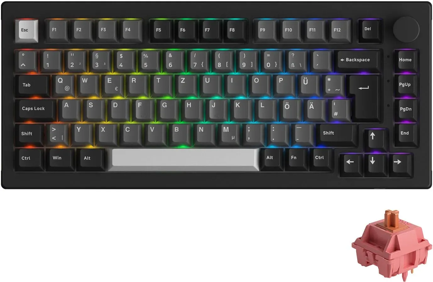 Numerische Tastaturen Computer & Büro PC-Zubehör Eingabegeräte Tastaturen - EAN:5099206085855 - - gefunden von Kelkoo Diese Akko mechanische Gaming-Tastatur bietet ein hochwertiges Tipperlebnis mit Hot-Swap-fähigen Switches und RGB-Beleuchtung. ![]() ![]() Akko 5075B Plus VIA Mechanische Tastatur, 75% ISO-Layout 3-Modus Gaming-Tastatur mit Hot Swappable Linear Switch, Cherry PBT-Tasten, Drehknopf für Win/Mac (Schwarz Silber, Rosewood)