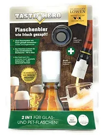Zustand: Gebraucht - 2,63 € / Stück - Heim & Küche Sportfan Heim & Küche - Taste Hero - 1er Set Taste Hero - EAN: 4063428011542 - WIE FRISCH AUS DEM ZAPFHAHN - Bier aus der Flasche, das mild und angenehm wie frisch gezapft schmeckt? Mit dem Taste Hero Bier-Aufbereiter wird dieser Traum war und Ihr Flaschenbier zum höchsten Genuss. ZUSÄTZLICHER SCHUTZ - Praktischer Nebeneffekt: Der Taste Hero Flaschenaufsatz verhindert das Eindringen von Insekten in Ihre Flasche und bewahrt Sie so vor bösen Überraschungen. GLAS ODER PET - Der Taste Hero Flaschenaufsatz passt auf jede handelsübliche Bierflasche - egal, ob Glas oder PET. Neben der Verwendung auf Bierflaschen lässt sich der Taste Hero Flaschenaufsatz auch bei jedem anderen kohlensäurehaltigen Getränk (Cola, Mineralwasser & Co. ) verwenden. WIEDERVERWENDBAR UND SPÜLMASCHINE GEEIGNET - Der Taste Hero Bier-Aufbereiter ist wiederverwendbar und für eine besonders einfache Reinigung spülmaschinengeeignet. - 1 Händler im amazon.de Marketplace Dieser Flaschenaufsatz ist eine günstige Möglichkeit, das aus "Die Höhle der Löwen" bekannte Produkt auszuprobieren. ![]() ![]() Taste Hero Flaschenaufsatz für Glas und PET Bier-Aufbereiter bekannt aus der Höhle der Löwen