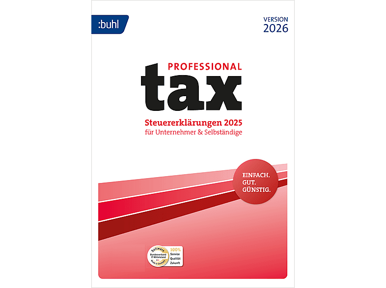 Kategorie: Office-Software - Buhl - GTIN:4011282006365 - Für Unternehmer, Freiberufler und Selbstständige ist die jährliche Steuererklärung deutlich umfangreicher als für den durchschnittlichen Arbeitnehmer. Sie müssen mehr Angaben machen und zusätzliche Formulare einreichen. tax Professional macht Schluss mit komplizierten Steuerformularen. Die Dialogeingabe fragt wie in einem Interview alle wichtigen Punkte ab und führt Sie gezielt zu einer ordentlichen Steuererklärung, die alle Sparmöglichkeiten ausnutzt. Mit tax Professional sparen Sie nicht nur Steuern, sondern auch teure Beratungskosten. Ohne Kompromisse bei der Qualität. Denn Gutes muss nicht teuer sein. Erledigen Sie bis zu 15 Steuererklärungen für 2025 mit tax 2026 Professional. - 39,99 Euro bei bücher.de - gefunden von billiger.de Ein preislich attraktives Angebot für die Software von notebooksbilliger.de. ![]() ![]() Buhl Data tax 2026 Professional Software