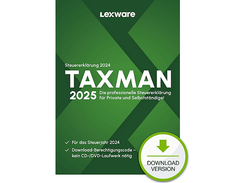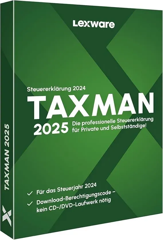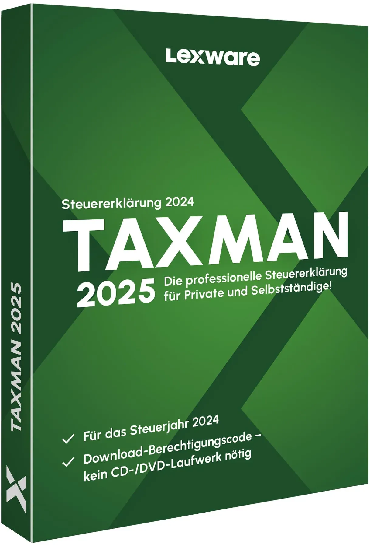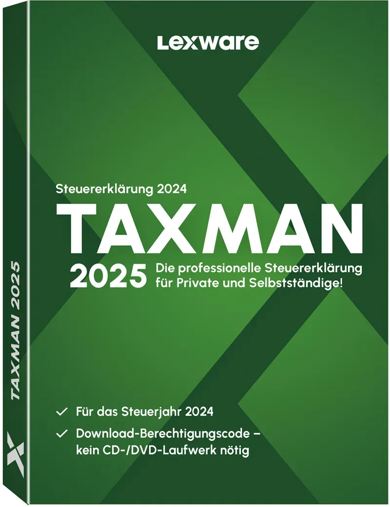 Anwendungssoftware Lifestyle Technik Computer - - Unkompliziert und benutzerfreundlich: die LEXWARE TAXMAN 2025 (für das Steuerjahr 2024) Software Vollversion (Download-Link)Die LEXWARE TAXMAN 2025 (für das Steuerjahr 2024) Software Vollversion (Download-Link) macht Ihre Steuererklärung zu einem Kinderspiel - so haben Sie mehr Zeit für angenehmere Dinge. Sie ist für all diejenigen passend, die mehr aus Ihrem Geld machen wollen.Technische Voraussetzungen im überblickDie technischen Eigenschaften, die Ihr Gerät mitbringen muss, kompakt für Sie:Notwendige Arbeitsspeicherleistung: 2 GBSystemvoraussetzungen: Windows 10/11 (dt. Version), Grafikauflösung mind. 1.366x768, Aktueller Webbrowser, Internetzugang und Produktaktivierung erforderlichLizenzgültigkeitsdauer: unbegrenztEinsetzen lässt sich der Artikel für ein Gerät und 5 Steuererklärungen. Beim Kauf des Artikels erhalten Sie eine Lizenz, die Ihnen eine uneingeschränkte Nutzung des Programms ermöglicht.Die Besonderheiten des ProduktsDer Artikel bietet folgende besonderen Features: Ratgeber.Aus diesen Modulen besteht der ArtikelDas Programm bietet ein umfangreiches und leistungsstarkes Spektrum. Diese praktischen Features sorgen für mehr Effizienz:Modul Steuererklärung: Formulare u. Anlagen (Mantelbogen, N, Kind, KAP, SO, V, R, FW, Eigenheimzulage, AUS, G, S, EüR, Unterhalt, L, Vorsorgeaufwand), Reisekosten-Rechner, Belegmanager, Lohnsteuerermäßigungs-Antrag, EüRMehr Möglichkeiten durch SchnittstellenUm Ihnen die Arbeit noch ... Für 32 Euro erhalten Sie hier die Standardversion als Download, was eine schnelle und unkomplizierte Installation ermöglicht. ![]() bora- computer.d e Lexware ESD Taxman 2025 Download
