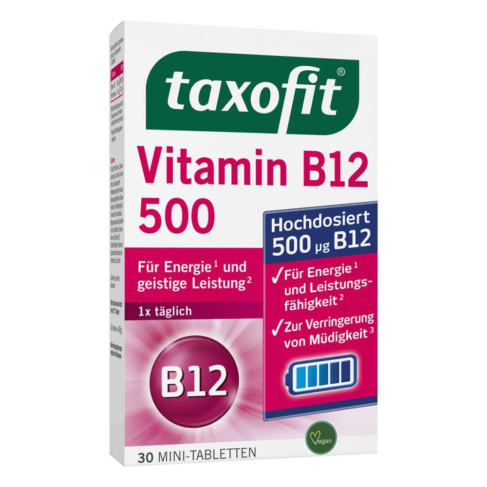 Taxofit b12 500 META PreisvergleichMit dem Meta-Preisvergleich suchen Sie gleichzeitig bei den großen Preisvergleich Portalen!Jetzt live Suche nach taxofit b12 500 starten! Taxofit b12 500 KaufberatungTaxofit B12 500 ist ein Nahrungsergänzungsmittel der Marke taxofit (von MCM Klosterfrau) mit hochdosiertem Vitamin B12 (500 µg pro Dosis, 20.000 % NRV), das den Energiestoffwechsel unterstützt, Müdigkeit reduziert und das Immunsystem fördert.[1][2][3][4] Beachten Sie: Es ersetzt keine ausgewogene Ernährung, überschreiten Sie nicht die Tagesdosis (1x täglich), lagern Sie trocken unter 25 °C und außer Reichweite von Kindern; bei Veganern/Vegetariern geeignet, da Varianten gluten-, laktose- und gelatinefrei sind.[1][2][3][7] Beliebte Produktmerkmale, Marken und ModelleTaxofit ist die dominante Marke in den Suchergebnissen mit Fokus auf hochdosiertes Vitamin B12 (500 µg), was für Energie und geistige Leistung beworben wird - ergänzt bei manchen Modellen durch Pantothensäure (B5) für mentale Performance oder Vitamin D3 + C für Immunsupport.[1][2][3][5] Beliebte Merkmale (basierend auf Produktbeschreibungen):