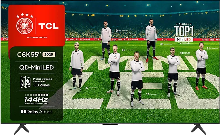 Zustand: Neu - Fernseher - TCL - 55Q6CX1 - EAN: 5901292526672 - QLED Mini LED mit Local Dimming & 4K HDR Premium - tiefer Kontrast & satte Farben: Die Kombination aus QLED-Technologie und präziser Mini-LED-Zonensteuerung sorgt für tiefe Schwarzwerte, intensive Helligkeit und herausragenden Kontrast. Mit 93€¯% DCI-P3 Farbraumabdeckung und 4K HDR Premium erleben Sie brillante Bilder in beeindruckender Farbtreue Dolby Vision IQ & Dolby Atmos - kinoreifes Seherlebnis zu Hause: Dolby Vision IQ passt die Helligkeit intelligent an Ihre Umgebung an, während Dolby Atmos Sie mit dreidimensionalem Klang umgibt. Tauchen Sie ein in Ihre Lieblingsinhalte mit mehr Tiefe und Realität als je zuvor Onkyo 2.1 Soundsystem - voller Klang ohne Zusatzgeräte: Das integrierte 2.1-Soundsystem von Onkyo liefert kräftige Bässe und klare Höhen - ideal für Filme, Musik und Serien. Kein externer Lautsprecher nötig, um echten Surround-Sound zu genießen Gaming auf Profi-Niveau - 144Hz, HDMI 2.1, AMD FreeSync Premium Pro & Game Master: Mit 144Hz Motion Clarity Pro, VRR, ALLM, HDMI 2.1, AMD FreeSync Premium Pro und dem Game Master-Modus ist dieser TV perfekt für Gamer - flüssige Bewegungen, minimale Latenz und optimale Kontrolle inklusive IMAX Enhanced & TÜV-zertifiziert - komfortables Fernsehen mit Schutz für die Augen: IMAX Enhanced sorgt für maximale Bildtiefe und visuelle Präzision. Das Display ist TÜV Rheinland zertifiziert für augenschonendes Fernsehen mit reduziertem Blaulicht - perfekt für ... ![]() ![]() TCL 55C6K 55 Zoll QLED MiniLED 4K Smart TV
