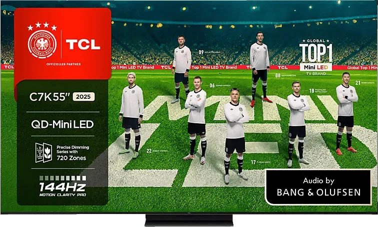 keine Angabe (Amazon Prime) Auf Lager Versand durch AmazonTCL 55Q7C QLED Mini LED Fernseher, 55 Zoll, 4K HDR Premium, Dolby Vision IQ & Atmos, Smart TV mit Google TV, Bang & Olufsen 6.2.2 Sound, 144Hz VRR, AMD FreeSync Premium Pro, HDMI 2.1, AirPlay 2, Alexa