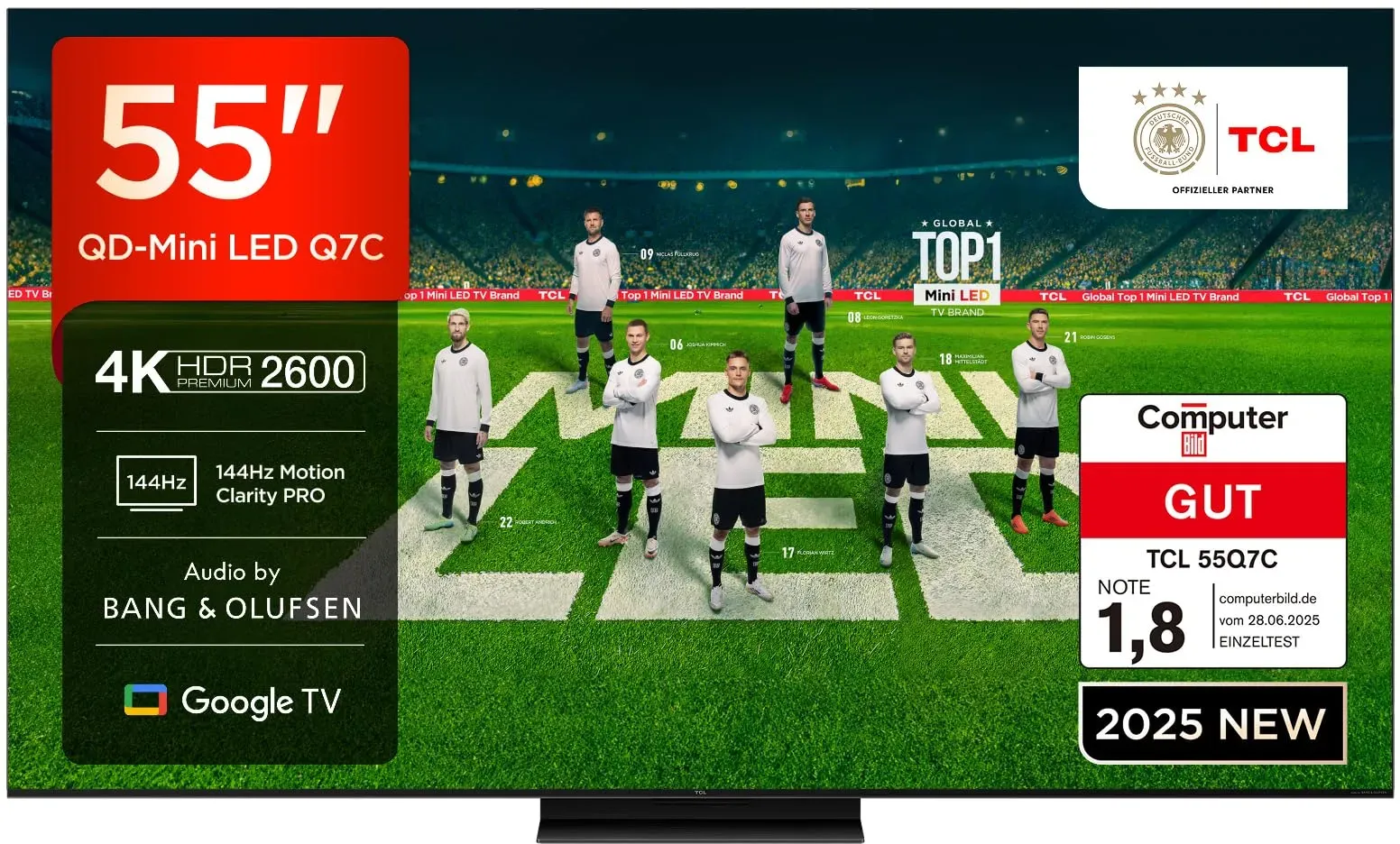 4 Händlerangebote bei billiger.de - EEK: F - Kategorie: Fernseher - TCL - QD-Mini LED Display mit 4K HDR Premium 2600 €“ maximale Helligkeit & Farbpräzision: Das hochmoderne Mini-LED-Panel mit QLED-Technologie bietet tiefes Schwarz, intensive Farben und ultrafeine Kontraststeuerung €“ unterstützt durch eine Spitzenhelligkeit von bis zu 2600 Nits und 97 % DCI-P3 Farbraumabdeckung. Dolby Vision IQ & Dolby Atmos €“ audiovisuelles Erlebnis auf Referenzniveau: Die dynamische Bildanpassung passt sich Ihrer Umgebung automatisch an. Dolby Atmos erzeugt einen raumfüllenden 3D-Klang mit beeindruckender Tiefe €“ perfekt für immersives Heimkino. 6.2.2 Soundsystem von Bang & Olufsen €“ Premium-Audio ohne Kompromisse: Das integrierte Soundsystem des dänischen Audioexperten liefert kristallklaren, kraftvollen Klang €“ perfekt abgestimmt auf Filme, Musik und Spiele. Kein externer Lautsprecher notwendig. (50 &115zoll sind Onkyo sound) Gaming auf Profi-Niveau €“ 144Hz, HDMI 2.1, AMD FreeSync Premium Pro: Genießen Sie verzögerungsfreies Gaming mit 144Hz Bildrate, VRR, ALLM, HDMI 2.1 und FreeSync Premium Pro €“ für besonders flüssige Darstellungen und exakte Kontrolle bei jeder Bewegung. Smart TV mit Google TV, Google Assistant & AirPlay 2: Zugriff auf tausende Apps, Streamingdienste und personalisierte Empfehlungen. Steuerung per Sprache über Google Assistant €“ oder kabelloses Teilen von Inhalten via AirPlay 2 oder Chromecast. - GTIN:5901292526610 ![]() ![]() TCL 55Q7C QLED Mini LED Fernseher, 55 Zoll, 4K HDR Premium, Dolby Vision IQ & Atmos, Smart TV mit Google TV, Bang & Olufsen 6.2.2 Sound, 144Hz VRR, AMD FreeSync Premium Pro, HDMI 2.1, AirPlay 2, Alexa, IMAX Enhanced