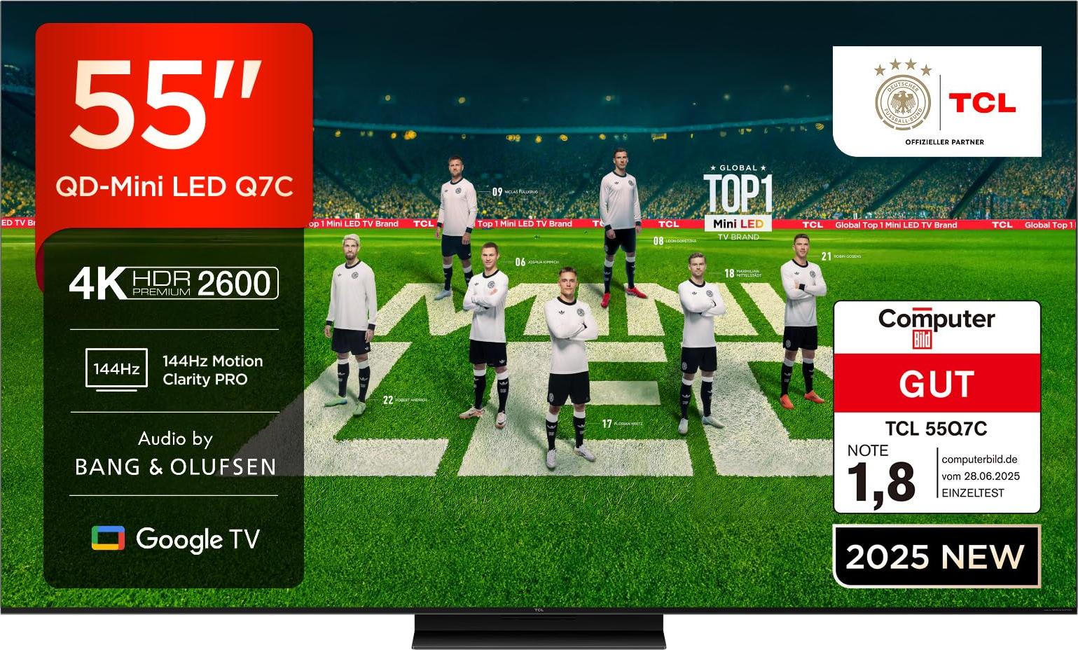 keine Angabe (Amazon Prime) Auf Lager Versand durch AmazonTCL 55Q7C QLED Mini LED Fernseher, 55 Zoll, 4K HDR Premium, Dolby Vision IQ & Atmos, Smart TV mit Google TV, Bang & Olufsen 6.2.2 Sound, 144Hz VRR, AMD FreeSync Premium Pro, HDMI 2.1, AirPlay 2, Alexa