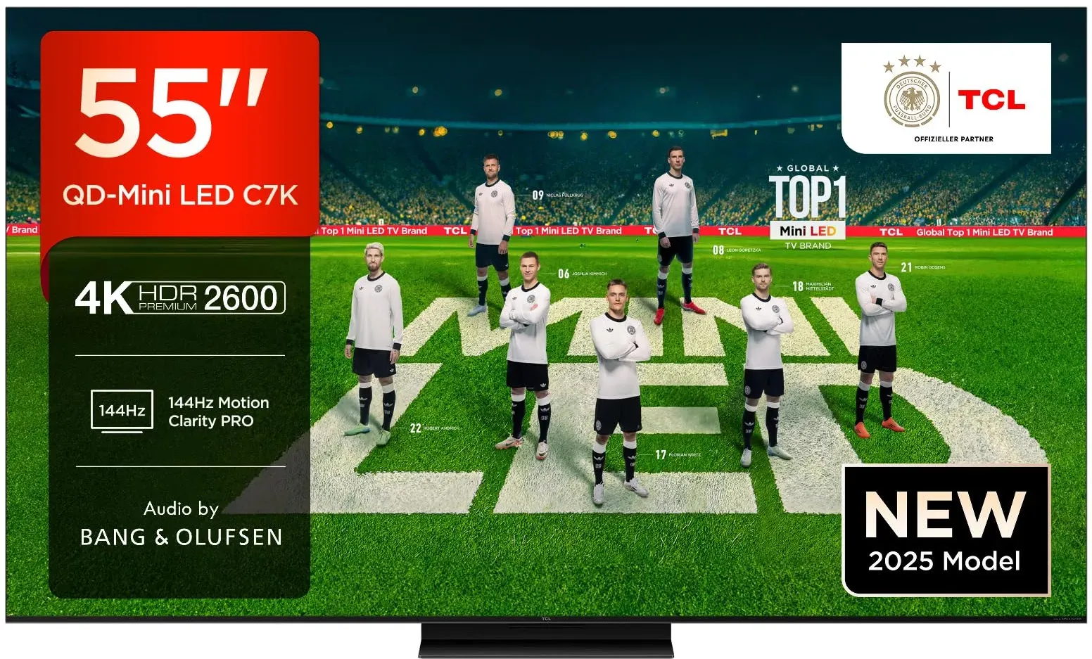 keine Angabe (Amazon Prime) Auf Lager Versand durch AmazonTCL 55C7K QD-Mini LED Fernseher, 55 Zoll, 4K HDR Premium, Dolby Vision IQ & Atmos, Bang & Olufsen Sound, Smart TV mit Google TV, 144Hz, HDMI 2.1, AMD FreeSync Premium Pro, AirPlay 2, Google Assistant