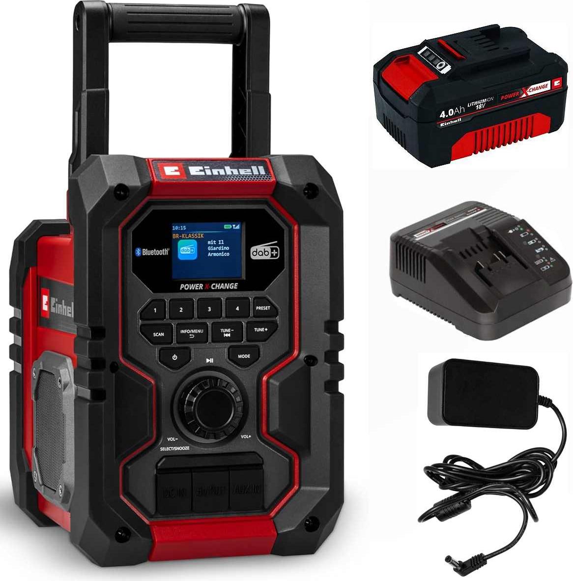 Kategorie: Radios - Einhell - GTIN:4049702727880 - Das Einhell Akku-Radio TE-CR 18 Li DAB+/FM/BT - Solo ist ein ideales Baustellenradio und Teil der Power X-Change Familie, deren Akkus und Ladegeräte flexibel kombiniert werden können. Alternativ lässt es sich über ein 1,8 m Netzkabel betreiben. Das Radio empfängt DAB+ und FM-Sender, speichert je 30 Sender und zeigt RDS-Infos wie Titel und Verkehr auf dem scharfen TFT-Farbdisplay. Musik ist zusätzlich via Bluetooth, USB und AUX abspielbar. über USB-Out lassen sich externe Geräte laden. Das IP65-geschützte, stoßfeste Gehäuse mit Softgrip und zwei Lautsprechern liefert kraftvollen Stereo-Sound – perfekt für Baustellen oder Outdoor-Einsätze. Features: Mitglied der Power X-Change Familie, 1x 18 V Akku notwendig Hybrid-Funktion: Radio nutzbar mit Akku oder Netzteil TFT-Display: scharf, farbig und mit Hintergrundbeleuchtung Jeweils 30 Sender-Speicherplätze für DAB+ und FM Automatischer Suchlauf für einfache Sendersuche RDS-Funktion: Infos zu Sender, Songs & Verkehr Musikwiedergabe zusätzlich via Bluetooth, AUX oder USB Equalizer zur individuellen Einstellung von Höhen und Tiefen Stabile, klappbare Antenne für optimalen Empfang Robustes Gehäuse mit stoßgedämpftem Rahmen Schutzklasse IP65: staubdicht und strahlwassergeschützt USB-Out-Schnittstelle zum Laden externer Geräte Sleeping-Mode zur automatischen Abschaltung des Radios Integrierter Wecker: bis zu 2 Weckzeiten einstellbar 2x große Lautsprecher für beste Stereo-Soundqualität ... Ein attraktives Bundle, das das Radio und einen 4,0 Ah Akku zu einem fairen Preis beinhaltet. ![]() ![]() Einhell TE-CR 18 Li + 1 x 4,0 Ah Akku