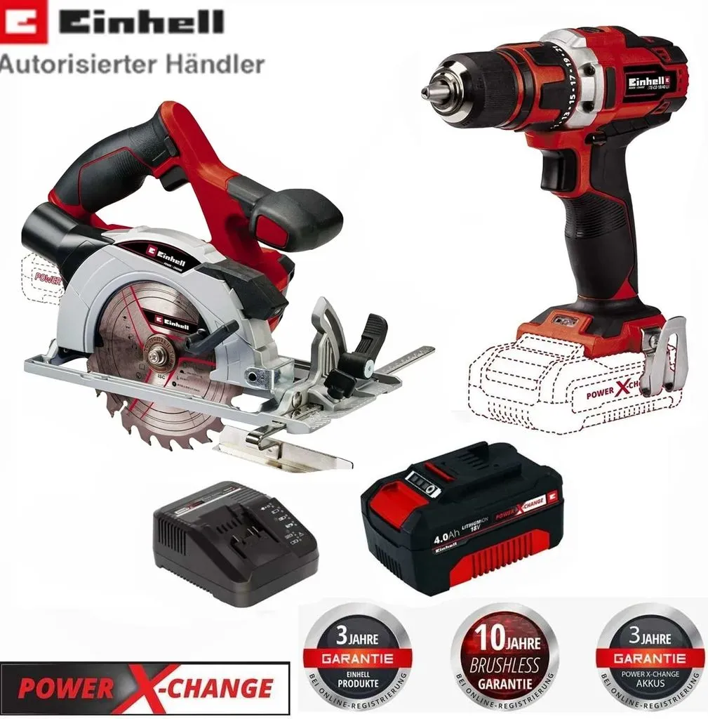 Kategorie: Akkuschrauber - Einhell - GTIN:4066738042275 - Einhell Akku-Bohrschrauber TE-CD 18/40 Li-Solo Power X-Change (Lithium-Ionen, 18 V, 40 Nm max. Drehmoment auf 21 Stufen, 2-Gang-Getriebe zum Bohren + Schrauben, Drehzahl-Elektronik, LED-Licht,Einhell Akku-Handkreissäge TE-CS 18/150 Li-Solo Power X-Change (18 V, Li-Ion, 150 x 10 mm Sägeblatt, Schnitttiefe + Neigungswinkel werkzeuglos einstellbar,mit Akku / Ladegerät ArtikelbeschreibungDer Einhell Akku-Bohrschrauber TE-CD 18/40 Li-Solo ist ein kraftvoller und handlicher Allrounder für alle Arbeiten im Haus, in der Werkstatt und der Garage. Als Mitglied der Power X-Change-Familie sind alle PXC-Akkus verwendbar und in der innovativen Lithium-Ionen System-Familie austauschbar. Für das kraftvolle Bohren und Schrauben steht ein leistungsfähiges Zwei-Gang-Getriebe zur Verfügung. Die Drehzahl-Elektronik sorgt dabei stets für material- und anwendungsgerechtes Arbeiten. Fein dosierbar in 21 Drehmomentstufen nimmt das einhülsige 13-mm-Bohrfutter das gewünschte Werkzeugzubehör auf. Für höchste Handlichkeit sind das ergonomische Design ebenso wie der Softgrip ausgelegt. Die LED-Beleuchtung bringt für optimale Ergebnisse Licht auch in dunkle Bereiche. Für stetige Einsatzbereitschaft sorgt die Li-Ion-Technologie ohne Selbstentladung. Die Einhell Akku-Handkreissäge TE-CS 18/150 Li - Solo ist klein, leicht und handlich zu bedienen und damit ideal für alle Arbeiten rund um Haus, Garten und Hobby. Als Mitglied der Power ... Dieses Angebot mit Akku, Ladegerät und Führungsschiene ist ideal für präzise Schnitte und professionelle Ergebnisse. ![]() ![]()