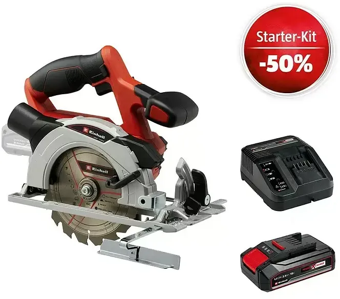 Kategorie: Handkreissägen - Einhell - GTIN:4006825647532 - Die Produktinformationen zu den Einzelprodukten entnehmen Sie bitte den unten verlinkten Einzelartikeln. # Einhell Power X-Change 18V kabellose Freiheit mit nur einem Akku Dieser Artikel ist Teil des Einhell Power X-Change 18V Akkusystems. Das System erlaubt es, mehr als 300 Akku-Geräte , ob Elektrowerkzeuge oder Gartengeräte, mit ein und demselben Akku zu betreiben. Vom allseits bekannten Akkuschrauber über die Stichsäge bis hin zum Rasenmäher ist mittlerweile eine Vielzahl an Werkzeugen als kabelfreie Akkuvariante verfügbar. Die Vorteile liegen auf der Hand: Unabhängig von Steckdosen und Kabeltrommeln arbeitet es sich leichter, mit dem Akkugerät ist man voll mobil. Zudem muss nicht mehr auf ein Sammelsurium verschiedenster Akkus und Ladegeräte zurückgegriffen werden. # Angebote & Aktionen # +++ *Aktion 02.10.-01.11.2025: PXC Starter-Kit für 15 statt 29,90 beim Kauf eines PXC Geräts +++ Legen Sie dieses Einhell Power X-Change Maschinen-Set in den Warenkorb und erhalten Sie * 1 PXC Gerät sowie * 1 PXC Starter Kit (18 V/2,5 Ah) (Akku und Ladegerät) zum Preis von 15 statt 29,95 Die 18 V Li-Ionen Akkus sorgen für ausdauernde Energieversorgung auf Baustellen, im Freien oder in der Werkstatt. Geladen werden die Akkus über das im Lieferumfang enthaltene Ladegerät, wodurch ein nahezu unterbrechungsfreies Arbeiten gewährleistet ist. Im BAUHAUS Sortiment sind viele weitere Power X-Change Heimwerker- und Gartengeräte von ... Dieses Angebot beinhaltet die Säge mit Akku und Ladegerät zu einem attraktiven Preis. ![]() ![]() Einhell TE-CS 18/150 Li Akku-Handkreissäge Schnitttiefe max. (90 ) 48 mm inkl. Akku, inkl. Ladegerät 18V 2.5Ah