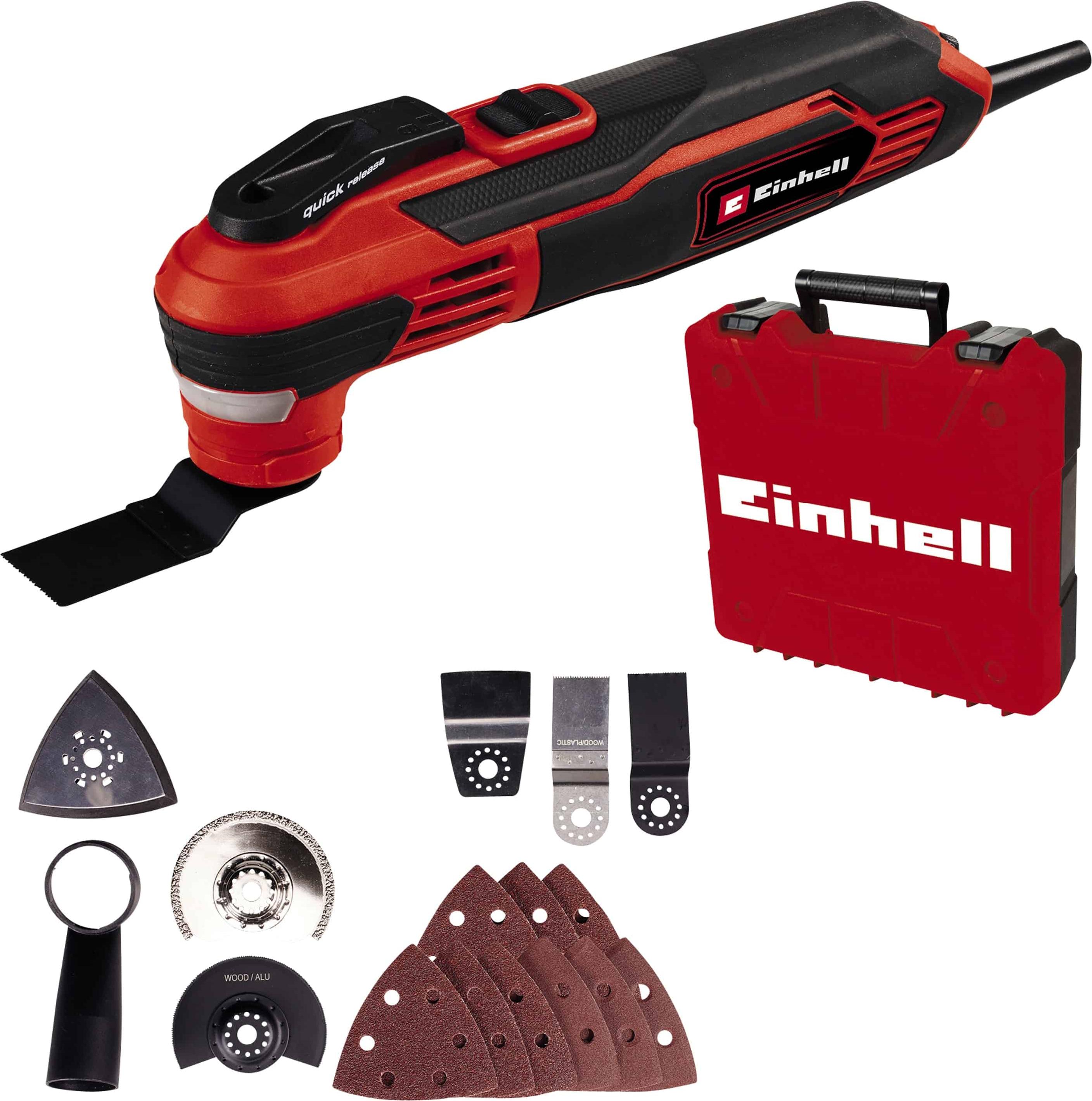 30 Händlerangebote bei billiger.de - Kategorie: Multifunktionswerkzeuge - Einhell - Das Multifunktionswerkzeug TE-MG 350 EQ ist ein praktischer Allrounder für ambitionierte Heimwerker. Mit dem Multifunktionswerkzeug lassen sich Holz und Kunststoff sowie Metall zuverlässig sägen und schleifen. Auch Fliesenfugen können im Handumdrehen entfernt werden. Der kraftvolle 350 W Motor bietet ausreichend Leistung für arbeitsintensive Projekte und die Drehzahlelektronik ermöglicht ein material- und anwendungsgerechtes Arbeiten. Die Konstant-Elektronik sorgt dabei für gleichbleibende Leistung. Der Schnellspannverschluss ermöglicht einen schnellen, werkzeuglosen Zubehörwechsel und die 12-fach einstellbare, magnetische Werkzeugaufnahme ermöglicht die einfache und optimale Positionierung des Zubehörs. Das integrierte LED-Licht sorgt für beste Sicht auf den Arbeitsbereich und der Schalter mit Feststellfunktion erleichtert langwierige Arbeiten. Das Multifunktionswerkzeug hat einen Oszillationswinkel von 3° und liegt dank seiner schlanken, ergonomischen Bauform mit Softgrip-Flächen jederzeit angenehm und sicher in der Hand. Die mitgelieferte Staubabsaugvorrichtung ist werkzeuglos montierbar. - GTIN:4006825665680 Mit 75.99 Euro ist dies ein preiswertes Angebot für das Einhell Multifunktionswerkzeug. ![]() EINHELL 4465155 - Multifunktionswerkzeug TE-MG 350 EQ