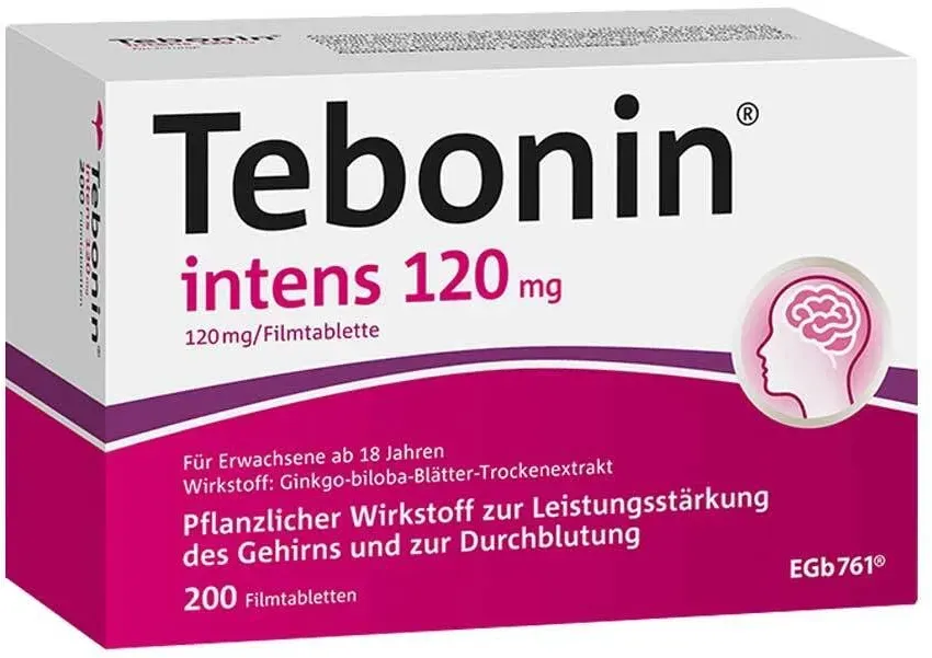 Zustand: Neu - 0,65 € / Stück - Rezeptfreie Medikamente - Tebonin intens Dr. Willmar Schwabe GmbH & Co. KG - 03379106 - EAN: 4150033791065 - Bei akutem Tinnitus kann Tebonin intens dazu beitragen, dass der Tinnitus* ganz verschwindet & bei einem chronifizierten Verlauf, die Belastung durch das Ohrgeräusch* zu verringern Tebonin intens 120 mg enthält den aus Blättern des Ginkgo-Baums hergestellten, hoch dosierten Spezialextrakt EGb 761(R) - einen der weltweit am besten untersuchten Pflanzenextrakte Gut verträglich: Der Wirkstoff ist auch für eine Langzeitanwendung geeignet / Dosierung: 1-2 x täglich eine Tablette einnehmen / Wirksam nach 2-4 Wochen / Einnahme über mind. 12 Wochen empfohlen Besonders hohe Qualität: Dr. Willmar Schwabe gewährleistet eine lückenlose Qualitätssicherung - vom Setzling bis zum fertigen Arzneimittel Lieferumfang: 200 x Tebonin intens 120mg / Enthält den Ginkgo-Spezialextrakt EGb 761(R) / Wirksam und gut verträglich bei akutem und chronischem Tinnitus* - 20 Händler im amazon.de Marketplace ![]() ![]() Tebonin intens 120 mg | 200 Stück | bei akutem & chronischem Tinnitus* | pflanzliches Arzneimittel mit Ginkgo Biloba Extrakt | unterstützt bei Ohrengeräuschen* & Schwindel | mit Ginkgo Spezialextrakt