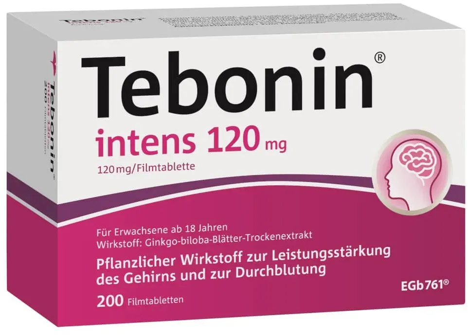 0.67 / 1 Stück - Kategorie: Arzneimittel - Dr. Willmar Schwabe - GTIN:4150033791065 - PZN:03379106 - Wirkstoff: Ginkgo-biloba-Blätter-Trockenextrakt. Anwendungsgebiete: Zur symptomatischen Behandlung von hirnorganisch bedingten geistigen Leistungseinbußen im Rahmen eines therapeutischen Gesamtkonzeptes bei fortschreitender Abnahme bzw. Verlust erworbener geistiger Fähigkeiten Hauptbeschwerden: Gedächtnis-/ Konzentrationsstörungen, Niedergeschlagenheit, Schwindel, Ohrensausen, Kopfschmerzen. Bevor die Behandlung begonnen wird, sollte geklärt werden, ob die Beschwerden nicht auf einer spezifisch zu behandelnden Grunderkrankung beruhen. Zur Verlängerung der schmerzfreien Gehstrecke bei arterieller Verschlusskrankheit in den Gliedmaßen, sog. 'Schaufensterkrankheit' im Rahmen physikalisch-therapeutischer Maßnahmen, insbes. Gehtraining. Warnhinweis: Bei Schwindel infolge von Durchblutungsstörungen oder altersbedingten Rückbildungsvorgängen. Zur unterstützenden Behandlung von Ohrgeräuschen infolge von Durchblutungsstörungen oder altersbedingten Rückbildungsvorgängen. Häufig auftretende Schwindelgefühle und Ohrensausen bedürfen grundsätzlich der Abklärung durch eine ärztin oder einen Arzt. Bei plötzlich auftretender Schwerhörigkeit bzw. einem Hörverlust sollte unverzüglich eine ärztin oder ein Arzt aufgesucht werden. Dr. Willmar Schwabe GmbH & Co. KG ? Karlsruhe Was enthält Tebonin intens 120 mg und wie wirkt es? Tebonin intens 120 mg enthält einen Extrakt aus den Blättern des ... ![]() Medpex.de