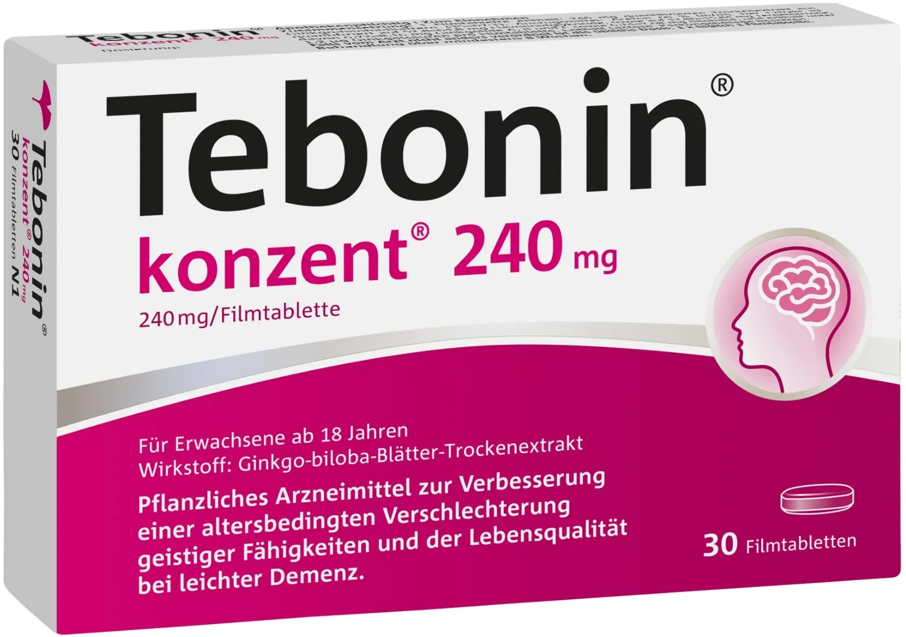 Kategorie: Arzneimittel - Dr. Willmar Schwabe - GTIN:4150077520164 - Erste Anzeichen von Vergesslichkeit? Tebonin konzent unterstützt gezielt Gedächtnis und Konzentration und kann so dabei helfen, geistig aktiv zu bleiben Tebonin konzent 240 mg enthält den aus Blättern des Ginkgo-Baums hergestellten, hoch dosierten Spezialextrakt EGb 761 - einen der weltweit am besten untersuchten Pflanzenextrakte Tebonin konzent fördert die Durchblutung sowie die Vernetzung der Nervenzellen und verbessert die Signalverarbeitung im Gehirn Gut verträglich: 1 x täglich eine Tablette einnehmen / Eine erste Wirkung kann bei konsequenter Einnahme nach ca. 2-4 Wochen bemerkt werden / Einnahme über mind. 8 Wochen empfohlen Lieferumfang: 30 x Tebonin konzent 240mg / Enthält Ginkgo-Spezialextrakt EGb 761(R) / Stärkt Gedächtnis und Konzentration / Frei von Lactose - 45,00 Euro bei Amazon Marketplace Health & Personal Care - gefunden von billiger.de Dieses eBay-Angebot für 48.43 Euro für 30 Tabletten ist eine weitere Option für eine kleine Packungsgröße. ![]() ![]() Tebonin konzent - 240 mg eBay Filmtabletten · 30 St · PZN 07752016