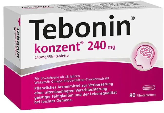 Verfügbarkeit: Lieferbar in 1-2 Werktagen - 1,07 €/St - Kategorie: Arzneimittel - Dr. Willmar Schwabe - GTIN:4150022938167 - PZN:02293816 - Zur Verbesserung einer altersbedingten kognitiven BeeinträchtigungTebonin konzent 240 mg gibt jetzt auch in einer kleineren Tablettenform bei bewährter Qualität und Wirksamkeit.Eigenschaften:Dosiert mit 240 mg Ginkgo-Premiumextrakt EGb 761.Frei von LaktoseBei zunehmender VergesslichkeitWer Konzentrationsfähigkeit und Gedächtnis unterstützen möchte, findet Hilfe in der Natur: Tebonin konzent 240 mg mit dem standardisierten Ginkgo-Spezialextrakt EGb 761 kann dem geistigen Abbau entgegenwirken. Wichtig dabei ist, dass die Tabletten rechtzeitig eingenommen werden, also sobald sich erste Anzeichen von Gedächtnisstörungen zeigen. Außerdem sollte Tebonin konzent 240 mg über längere Zeit angewendet werden.Verschiedene Mechanismen tragen zur gut untersuchte Wirksamkeit des Präparates bei. So verbessert Tebonin konzent 240 mg die Durchblutung auch der feinsten Blutgefäße, die unsere grauen Zellen mit Sauerstoff und Nährstoffen versorgen.Außerdem werden Flexibilität und Anpassungsfähigkeit des Gehirns durch den Ginkgo-Spezialextrakt EGb 761 erhöht. Und schließlich wirkt sich Ginkgo positiv auf jene Botenstoffe aus, die für Gedächtnis und Merkfähigkeit wichtig sind.Anwendung:Mit Tebonin konzent 240 mg ist es einfach, etwas fürs Gehirn zu tun: Dank der hohen Dosierung genügt eine Tablette pro Tag. Bei ... Dieses Angebot von DocMorris Apotheke für 80 Tabletten ist eine praktische GröÃ?e für den mittelfristigen Bedarf. ![]() ![]() Dr. Willmar Schwabe Tebonin konzent 240 mg 80 St