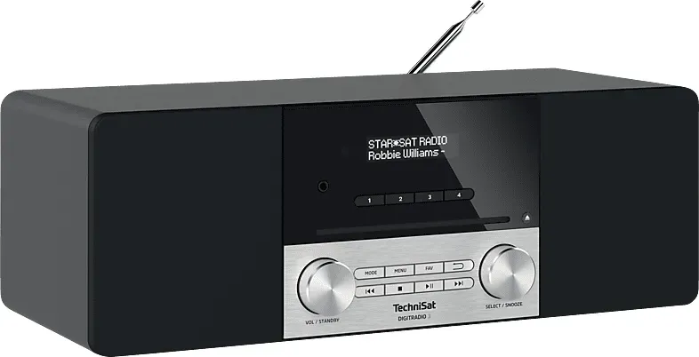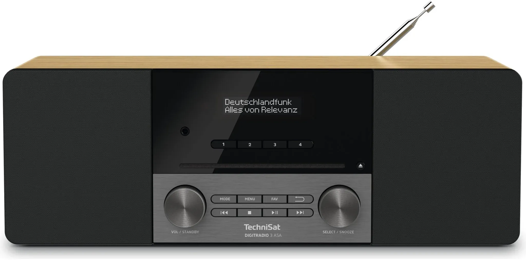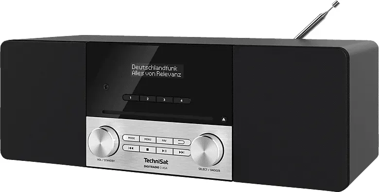 Zustand: Neu - Kompaktanlagen - TechniSat TechniSat Digital GmbH - 0000/3984 - EAN: 4019588039841 - Digitalradio mit ASA Technologie: ASA kann die Bevölkerung in Not- und Krisenfällen digital und zuverlässig mit Informationen versorgen - auch dann, wenn andere Kommunikationswege wie das Internet oder der Mobilfunk vor Ort unterbrochen sind Hervorragender Stereosound: Powerd by Elac mit 2x10 W Lautsprechern überzeugt das Radio durch ein hochwertiges Holzgehäuse mit Aluminium-Front und intuitive Bedienung am Gerät oder per Fernbedienung Volle Flexibilität: Musik per Bluetooth vom Handy oder Tablet streamen, MP3 per USB (inkl. Ladefunktion) oder AUX in. Radiowecker mit Sleeptimer und ein Favoritenspeicher runden das Design-Radio ab CD-Spieler mit MP3 und Resume-Funktion: Der CD Player startet nach dem Ausschalten beim erneuten Einschalten wieder an der zuletzt gehörten Stelle - Optimal für Fans von Hörbüchern Lieferumfang : 1 x DIGITRADIO 3 ASA - Stereo-Radio Made in Germany , Teleskopantenne, F-Stecker-Werkzeug (für die abnehmbare Antenne), Netzteil, Fernbedienung inkl. Batterien, Bedienungsanleitung - Produktmaße (BxHxT): 38 x 13 x 16,8 cm - bei Amazon.de Mit 199.99 Euro ist dieses Modell von Media Markt eine gute Wahl, wenn Sie die Automatic Safety Alert (ASA) Funktion wünschen. ![]() ![]() TECHNISAT DIGITRADIO 3 ASA DAB+ Radio, FM, DAB+, Bluetooth, Schwarz/Silber