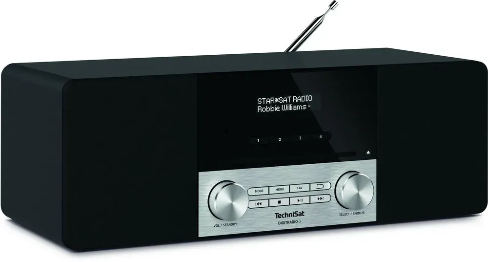 Verfügbarkeit: Auf Lager - Kategorie: CD-Radios - TechniSat - GTIN:4019588139138 - Qualität Made in Germany: Entwicklung und Produktion des empfangsstarken Digitalradio erfolgen in Deutschland nach höchsten Qualitätsstandards von TechniSat - Klang in Perfektion Hervorragender Stereosound: Powerd by Elac mit 2x10 W Lautsprechern überzeug das Radio durch ein hochwertiges Holzgehäuse mit Aluminium-Front und intuitive Bedienung am Gerät oder per Fernbedienung Volle Flexibilität: Musik per Bluetooth vom Handy oder Tablet streamen, MP3 per USB (inkl. Ladefunktion) oder AUX in. Radiowecker mit Sleeptimer und ein Favoritenspeicher runden das Design-Radio ab CD-Spieler mit MP3 und Resume-Funktion: Der CD Player startet nach dem Ausschalten beim erneuten Einschalten wieder an der zuletzt gehörten Stelle - Optimal für Fans von Hörbüchern Lieferumfang: Stereo-Radio DIGITRADIO 3, Teleskopantenne, Fernbedienung inkl. Batterien, Bedienungsanleitung, Produktmaße: 38 x 13 x 16,8 cm (BxHxT) - 209,99 Euro bei Amazon Marketplace CE - gefunden von billiger.de Das TechniSat DigitRadio 3 von jacob.de für 215.89 Euro ist ein solides Audiosystem mit 2x10 Watt Leistung in Schwarz/Silber. ![]() ![]() TechniSat DigitRadio 3 - Audiosystem - 2 x 10 Watt - Schwarz, Silber