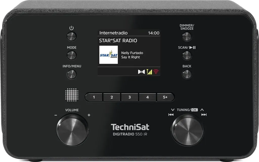 Zustand: Neu - Internet-Radios Internet Radios - TechniSat - 0000/3995 - EAN: 4019588039957 - Vielseitiges Digitalradio DAB+ und Internet-Radio ermöglichen rauschfreies & klangstarkes Radio bei extrem robustem Empfang / Analoge UKW Radiostationen sind ebenso zuverlässig empfangbar Stereo Sound Zwei 5 Watt starke Lautsprecher sorgen für satten und klaren Klang / Intuitive Bedienung am Gerät oder per App Flexible Einsatzmöglichkeiten Musikdateien können einfach über die USB-Schnittstelle oder via Bluetooth Audiostreaming von Smartphone oder Tablet wiedergeben werden Features & Anschlüsse Dimmbares 2,4 Zoll Farbdisplay, Senderspeicher (20x DAB+ / 20x UKW), Sleeptimer, Wecktimer / USB (MP3 Wiedergabe und Ladefunktion), AUX in, Kopfhöreranschluss Lieferumfang TechniSat DIGITRADIO 550 IR, schwarz, Fernbedienung, Bedienungsanleitung, Produktmaße (BxHxT) 21 x 14 x 12 cm - bei Amazon.de Jetzt live Meta-Preisvergleich starten! Technisat digitradio 550 ir Testberichte