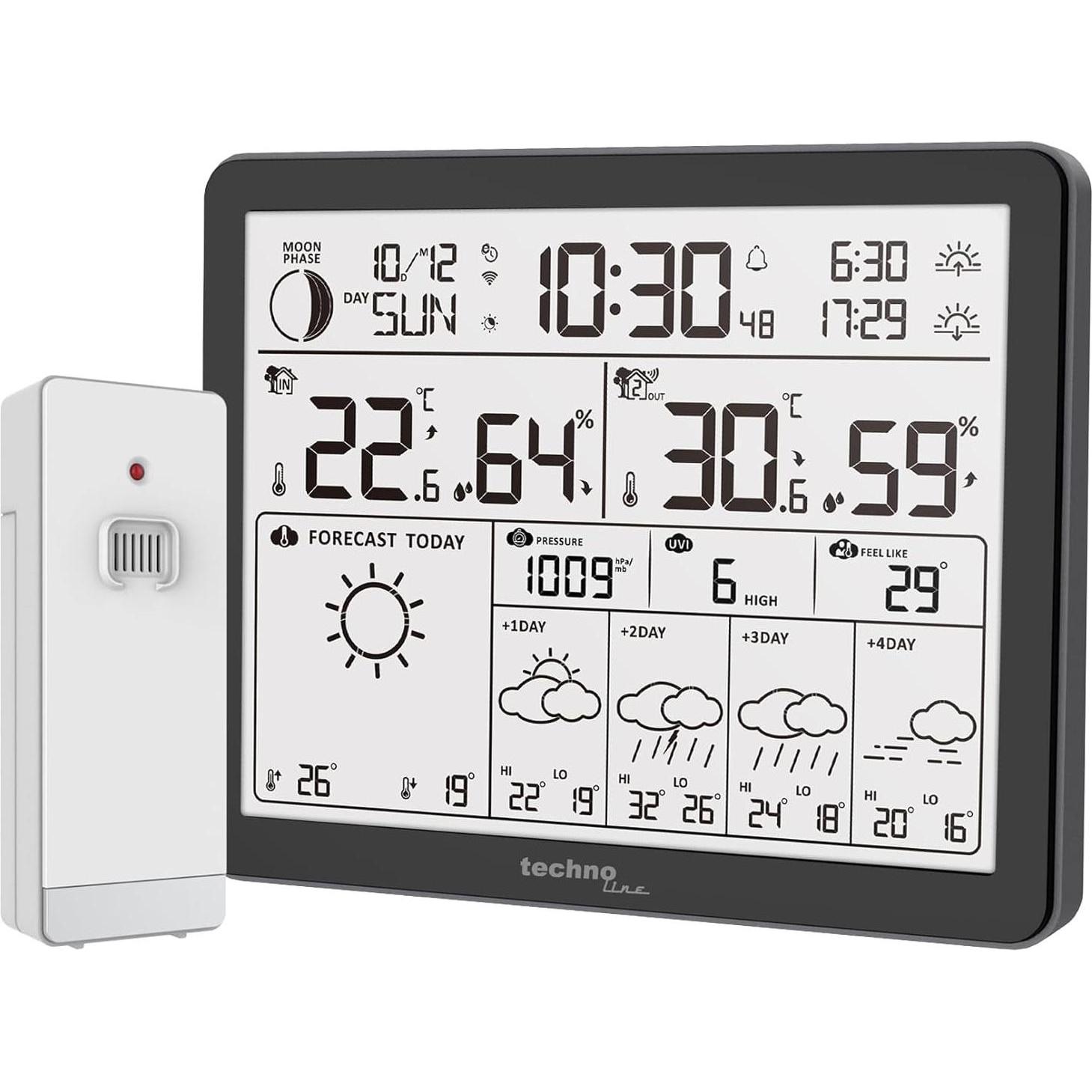 Zustand: Neu - Wetterstationen - Technoline Technotrade Import-Export GmbH - WD3000 - EAN: 4029665430010 - Daten auf Display und in App: Tuya smart (iOS oder Android) Uhrzeit und Kalender Innen- und Außentemperatur, sowie Innen-und Außenluftfeuchtigkeit Wochentage, Höchst- und Mindesttemperaturen sowie Wettervorhersagen für heute und die nächsten vier Tage barometrischer Luftdruck Zeit des Sonnenaufgangs und Sonnenuntergangs Anzeige der Mondphase UV-Index-Anzeige gefühlte Werte (Feels Like)-Anzeige - Verkäufer: Voelkner im amazon.de Marketplace ![]() ![]() Technoline WD3000 Schwarz