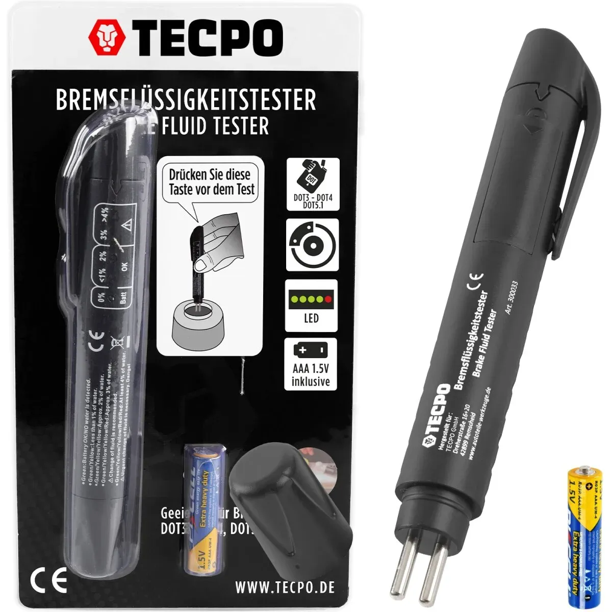 Zustand: Neu - Bremsenentlüfter - TECPO - 80002140 - - Elektronischer Bremsflüssigkeitstester inkl. 1.5V Batterie (AAA) Messung von Wassergehalt, geeignet für Bremsflüssigkeiten DOT3, DOT4, DOT5.1 nicht geeignet für DOT5 Bremsflüssigkeit zum schnellen Messen des Wassergehalts, einfach Prüfspitzen vollständig in Bremsflüssigkeit eintauchen und Ergebnis der LED-Anzeige entnehmen detaillierte Ergebnisanzeige in 5 Stufen: 0% / 4% (Anteil Wassergehalt) - Verkäufer: TECPO GmbH im amazon.de Marketplace ![]() ![]() 2x TECPO - ELEKTRONISCHER BREMSFLÜSSIGKEITSTESTER eBay BREMSFLÜSSIGKEIT MESSEN DOT4