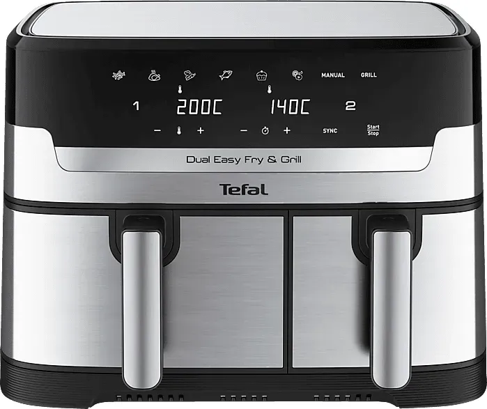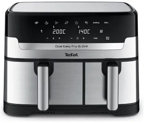 Kategorie: Fritteusen - Tefal - GTIN:3045380024236 - Doppelte Heißluftfritteuse, 8.3 Liter, 2.7 kW, rostfreier Edelstahl - 161,76 Euro bei Proshop.de - gefunden von billiger.de Jacob.de bietet die Tefal EY905D für 166.29 Euro an, was ein fairer Preis für die 8,3 Liter Version ist. ![]() ![]() Tefal Dual Easy Fry & Grill EY905D Doppel 8,3 l Eigenständig 2700 W Heißluftfritteuse Edelstahl (EY905D DUAL EASY FRY & GRILL)