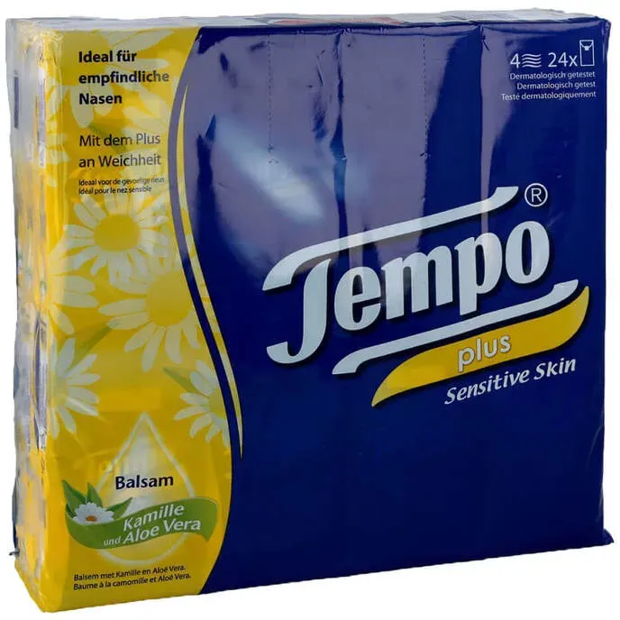 6 Händlerangebote bei billiger.de - Kategorie: Arzneimittel - TENA - 24x9, 24 Stück Die Nase läuft, ist gerötet und empfindlich? In der Schnupfenzeit können Sie sich auf Tempo jederzeit verlassen: Tempo plus Sensitive Skin ist dank einem Balsam aus Kamille und Aloe Vera besonders weich und verwöhnt so Ihre empfindliche Nase. Auch wenn nach der Erkältungszeit die Heuschnupfensaison vor der Türe steht, ist Tempo plus Sensitive Skin der ideale Alltagsbegleiter. Nutzen Sie hierzu auch die Services unseres Gesundheitsportals in der Heuschnupfenzeit informieren wir Sie tagesaktuell über die Pollenbelastung in Ihrer Stadt: www.health.tempo.net. Dorthin gelangen Sie außerdem ganz einfach über den QR-Code auf der Tempopackung. Und damit Sie noch besser durch die Pollensaison kommen, empfehlen wir unsere Gratis-App Pollenwarner mit nützlichen Informationen über den aktuellen Pollenflug. übrigens: Nur für kurze Zeit gibt es Tempo plus Sensitive Skin als begehrte Sondergröße 36+6x9. - Vierlagige Taschentücher - Enthält Balsam mit Kamille und Aloe Vera, ideal für empfindliche Nasen - Hergestellt mit der neuen Soft-Komfort-Technologie - Praktische Komfortöffnung - Erhältlich in den Größen 12x9, 24x9 sowie als Vorratspack in der Größe 36x9 Tempo 830306, Weiß, Einfarbig, Box, 24 Stück(e), 240 mm, 90 mm Tempo 830306. Produkthauptfarbe: Weiß, Oberflächenfärbung: Einfarbig, Verpackungsart: Box. Breite: 240 mm, Tiefe: 90 mm - GTIN:7322540786668 - PZN:15317895 ![]() ![]() Essity Germany GmbH Tempo Soft & Sensitive Taschentücher, Papiertaschentücher für besonders empfindliche Nasen, 1 Packung = 12 x 9 Tücher = 108 Tücher 830308