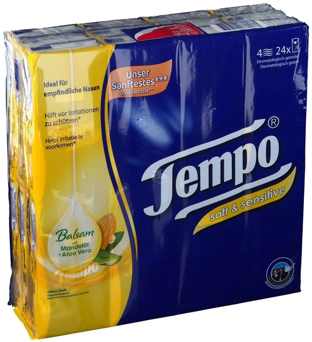 Badezimmer Wohnen - - soft sensitive - die Tempo Taschentücher für empfindliche NasenDie Tempo Taschentücher mit Balsam mit Mandelöl + Aloe Vera schützen vor Hautirritationen und pflegen gleichzeitig die sensitiven Schnupf- und Allergikernasen. Die Tempo soft sensitive sind somit auch für besonders empfindliche Nasen bestens geeignet. Die Quick Easy öffnung der Boxen besteht aus Papier anstelle von Plastik und die Boxen sind CO2-reduziert und 100 % recycelbar.Tempo + Waschmaschine = kein ProblemEin in der Hosentasche vergessenes Taschentuch kann in der Waschmaschine für ärger sorgen. Die 4-lagigen Tempo-Tücher aus Zellstoff sind deshalb nassfest und überstehen auch einen Waschgang in der Maschine, ohne sich dabei aufzulösen.Damit Sie immer ein Taschentuch griffbereit haben, bestellen Sie die Tempo soft sensitive Box jetzt mit 90 Tüchern Inhalt direkt hier bei uns im Online-Shop. - Versandkostenfrei: false - Sale: true - - - bei Büroshop24 - gefunden von shopping24 ![]() ![]() Tempo Taschentücher - soft & eBay sensitive 12 Packungen