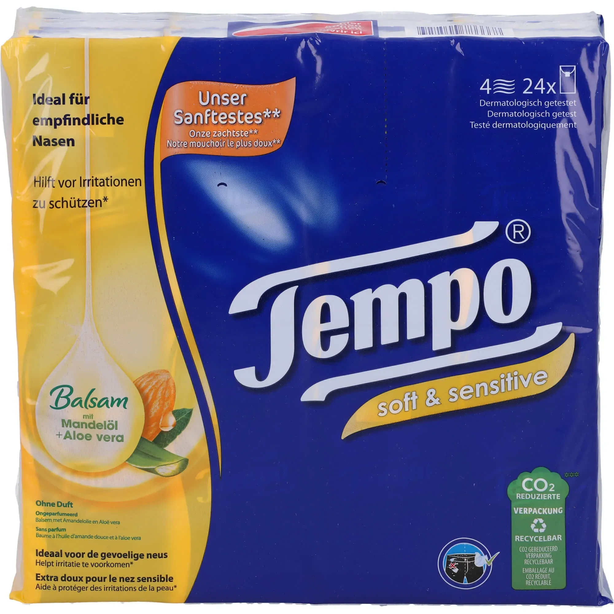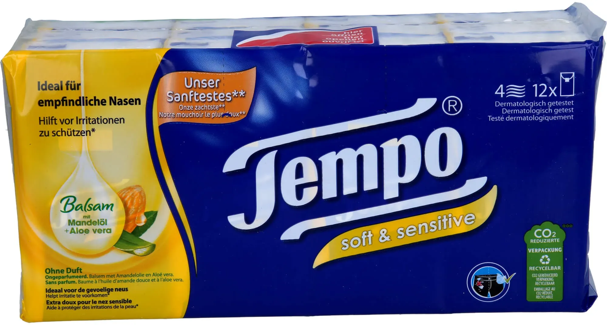 Tempo - EAN: 7322541409429 - soft & sensitive die Tempo Taschentücher für empfindliche NasenDie Tempo Taschentücher mit Balsam mit Mandelöl + Aloe Vera schützen vor Hautirritationen und pflegen gleichzeitig die sensitiven Schnupf- und Allergikernasen. Die Tempo soft & sensitive sind somit auch für besonders empfindliche Nasen bestens geeignet. Die Quick & Easy öffnung der Boxen besteht aus Papier anstelle von Plastik und die Boxen sind CO2-reduziert und 100 % recycelbar.Tempo + Waschmaschine = kein ProblemEin in der Hosentasche vergessenes Taschentuch kann in der Waschmaschine für ärger sorgen. Die 4-lagigen Tempo-Tücher aus Zellstoff sind deshalb nassfest und überstehen auch einen Waschgang in der Maschine, ohne sich dabei aufzulösen.Damit Sie immer ein Taschentuch griffbereit haben, bestellen Sie die Tempo soft & sensitive Box jetzt mit 90 Tüchern Inhalt direkt hier bei uns im Online-Shop. - bei printus.de - aus Yadore Produktdaten ![]() ![]() TEMPO Taschentücher soft & sensitive 12X9 St