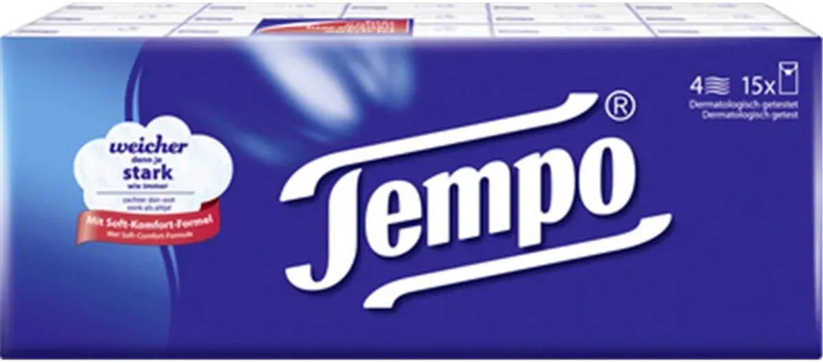 18 Händlerangebote bei billiger.de - Kategorie: Hygieneartikel - Tempo - Das Original von Tempo in bewährter Qualität - weiche und starke Taschentücher mit innovativer Soft-Komfort-Technologie Dank der neuen Soft-Komfort-Technologie sind die Tempos besonders weich und angenehm auf der Haut Die 4-lagigen Tempos sind reißfest, weich und lösen sich selbst beim versehentlichen Waschgang in der Waschmaschine nicht auf Die praktische Komfortöffnung ermöglicht eine einfache Entnahme der Päckchen - Tempo Tücher sind dermatologisch getestet Lieferumfang: 30 x Taschentücher Päckchen (30 x 10 Tücher) von Tempo - das Synonym für Papiertaschentücher seit mehr als 8 n - GTIN:7322540788709 - PZN:07312004 ![]() ![]() Tempo Original Taschentücher Box