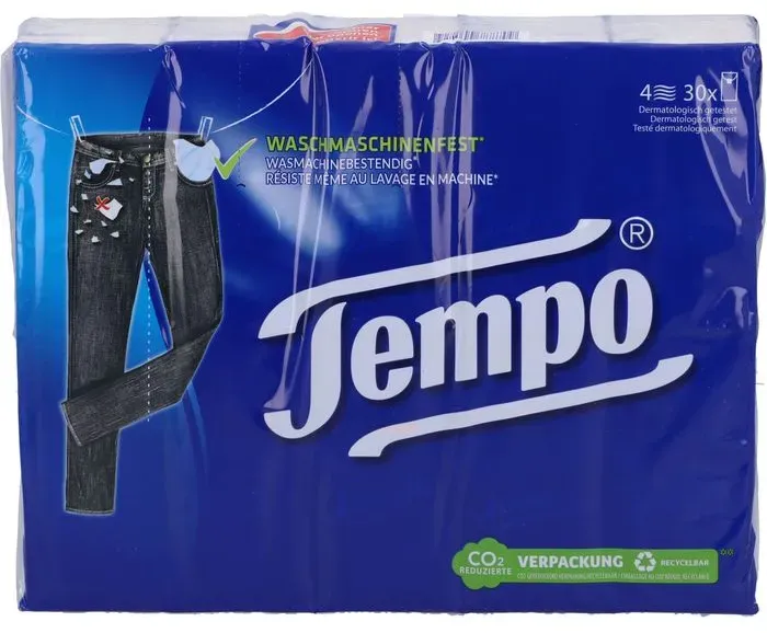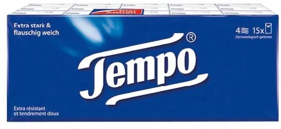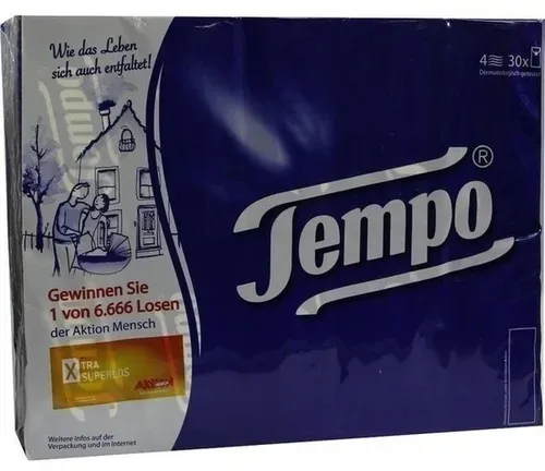 0.01 / 1 ct - Kategorie: Hygieneartikel - Tempo - GTIN:7322540788709 - PZN:07312004 - 07312004: Essity Germany GmbH - TEMPO Taschentücher ohne Menthol 300 St - 3,52 Euro bei ayvita.de - gefunden von billiger.de ![]() ![]() Tempo Taschentücher Klassik 4-lagig 30 x 10 St.