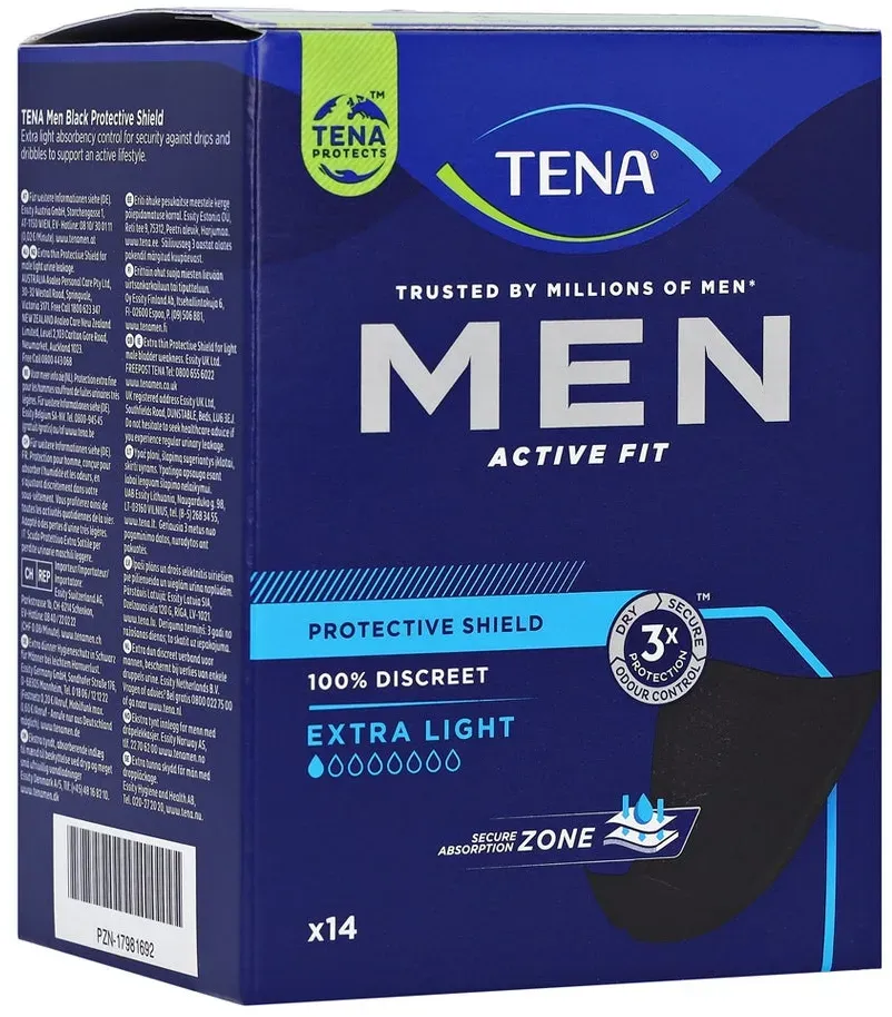 0,70 /Stück - Kategorie: Inkontinenz - TENA - GTIN:7322541691770 - Die TENA Men Active Fit Protective Shield Inkontinenzeinlagen mit Dreifachschutz schützen vor Auslaufen, feuchtigkeit und Gerüchen. Der diskrete und bequeme Schutz ist nur 3 mm dünn und in dezentem Schwarz gehalten. Die Inkontinenzslips absorbieren leichten Hernverlust und einzelne Tropfen und sorgt für ein frisches und sicheres Gefühl. Die Einlage wurde speziell für die männliche Körperform entwickelt und überzeugt durch ihre weiche Dreiecksform und die sichere Absorptionszone, die Flüssigkeit zuverlässig einschließt. Die Einlagen sind für zusätzlichen Benutzerkomfort einzeln verpackt und wer - 9,80 Euro bei hygi.de - gefunden von billiger.de Dieses Angebot ist ein Einzelpack zu einem durchschnittlichen Preis von 12,29 Euro. Medpex.de Essity Germany GmbH Health and Medical Solutions TENA Men Active Fit Level 1 Inkontinenzeinlagen 24 St