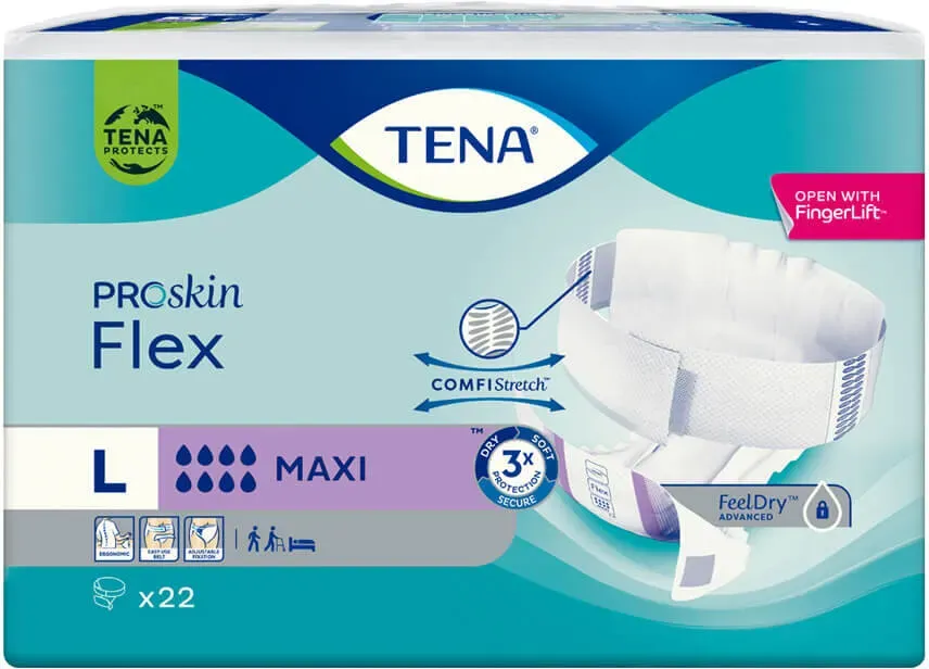 0,96 / 1 Stück - Kategorie: Inkontinenz - TENA - GTIN:7322540647204 - TENA ProSkin Slip Maxi Die Einweghose bei starker Harninkontinenz Atmungsaktive Inkontinenzslips für schwere Inkontinenz Die TENA ProSkin Slip Maxi Produktreihe bietet umfassenden Schutz und hohen Tragekomfort für Menschen mit schwerer Harninkontinenz. Diese anatomisch geformten Slips sind sowohl für Männer als auch für Frauen geeignet und bieten eine optimale Lösung für den täglichen Gebrauch und besonders für die Nachtversorgung. Die TENA ProSkin Slips sind in verschiedenen Größen erhältlich, um den individuellen Bedürfnissen gerecht zu werden. Zuverlässiger Schutz bei schwerer Inkontinenz Die TENA ProSkin Slip Maxi ConfioAir sind speziell entwickelt, um Menschen mit schwerer Harninkontinenz einen sicheren Rundumschutz zu bieten. Der hochabsorbierende Kern nimmt Flüssigkeiten schnell auf und schließt sie sicher ein, wodurch die Haut trocken und vor Irritationen geschützt bleibt. Die atmungsaktiven Materialien lassen die Luft zirkulieren, fördern die Hautgesundheit und bieten gleichzeitig maximalen Tragekomfort. Diese Slips sind ideal für den Tag und bieten durch ihre verstärkte Saugfähigkeit auch während der Nacht einen sicheren Schutz. Extra diskret und komfortabel Die TENA ProSkin Slip Maxi ConfioAir zeichnen sich durch eine Vielzahl technischer Merkmale aus, die den Tragekomfort und die Sicherheit erhöhen. Die FeelDry AdvancedTM-Technologie sorgt dafür, dass die Flüssigkeit schnell von der ... Ein Einzelpack der Tena ProSkin Flex Maxi L, ideal zum Testen oder für den gelegentlichen Gebrauch. ![]() ![]() TENA ProSkin Flex Maxi L, 22 Stück